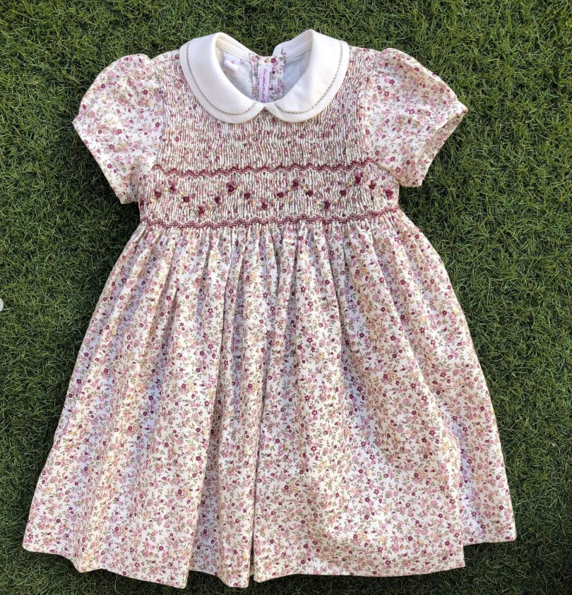 ABITO IN COTONE FANTASIA FIORELLINI ROSA BORDEAUX E FOGLIOLINE VERDI, CON SMOCK E COLLO TRAFORATO