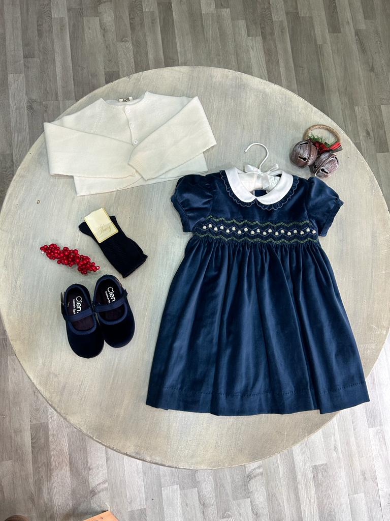 Abito in velluto liscio con punto smock a zig zag e fiorellini panna e verde. Il colletto ha un profilo a fiore in tinta con l'abito