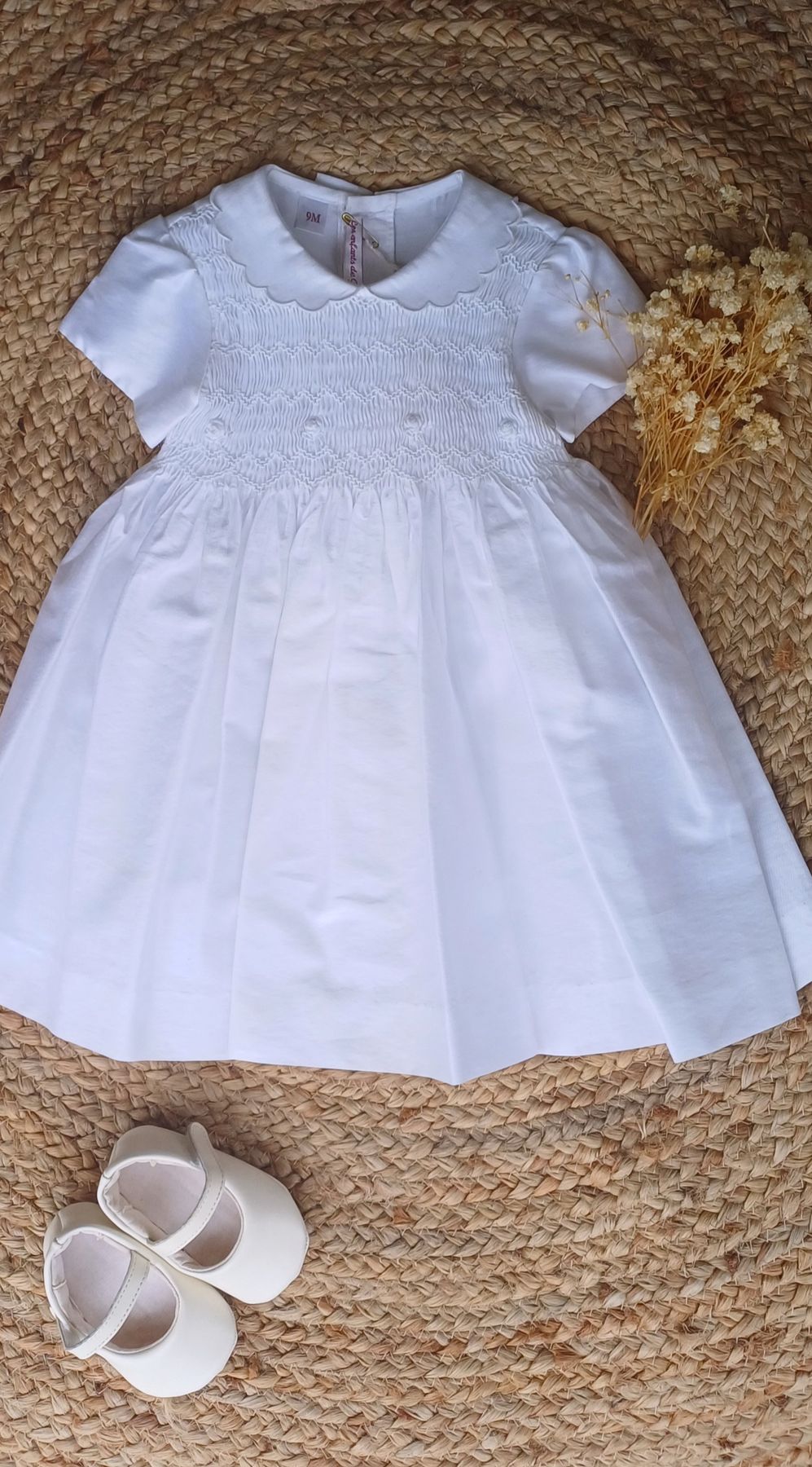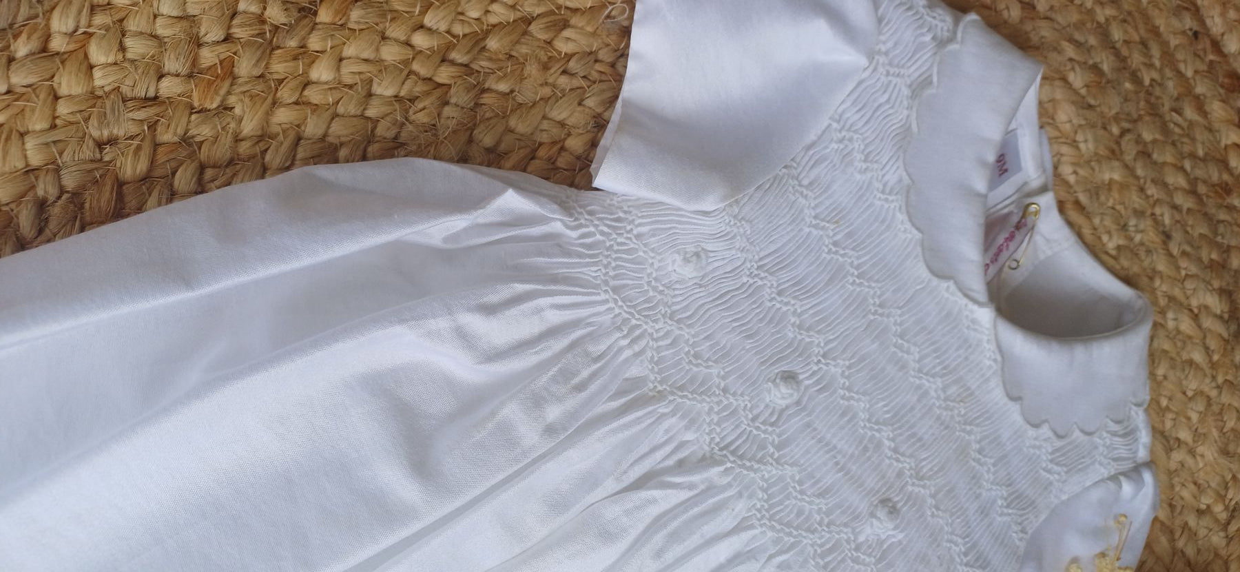 Abito della collezione Battesimale di Les Enfant de Giselle, con ampio punto smock rifino con ricami di roselline in tinta bianco avorio. Abbottonatura sul retro.