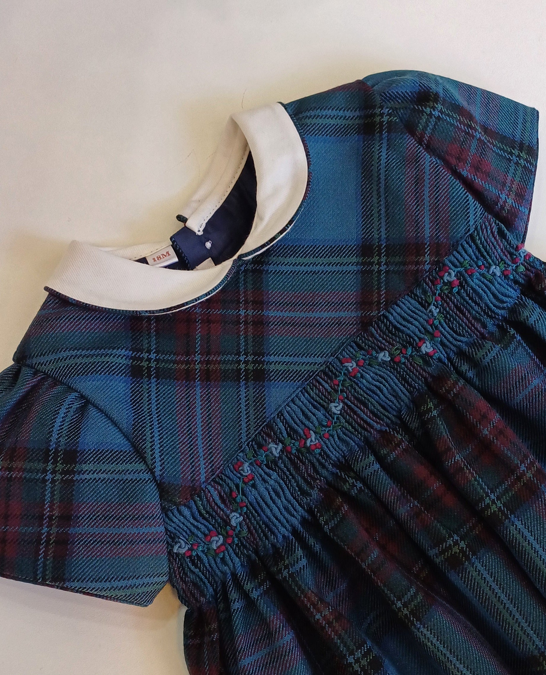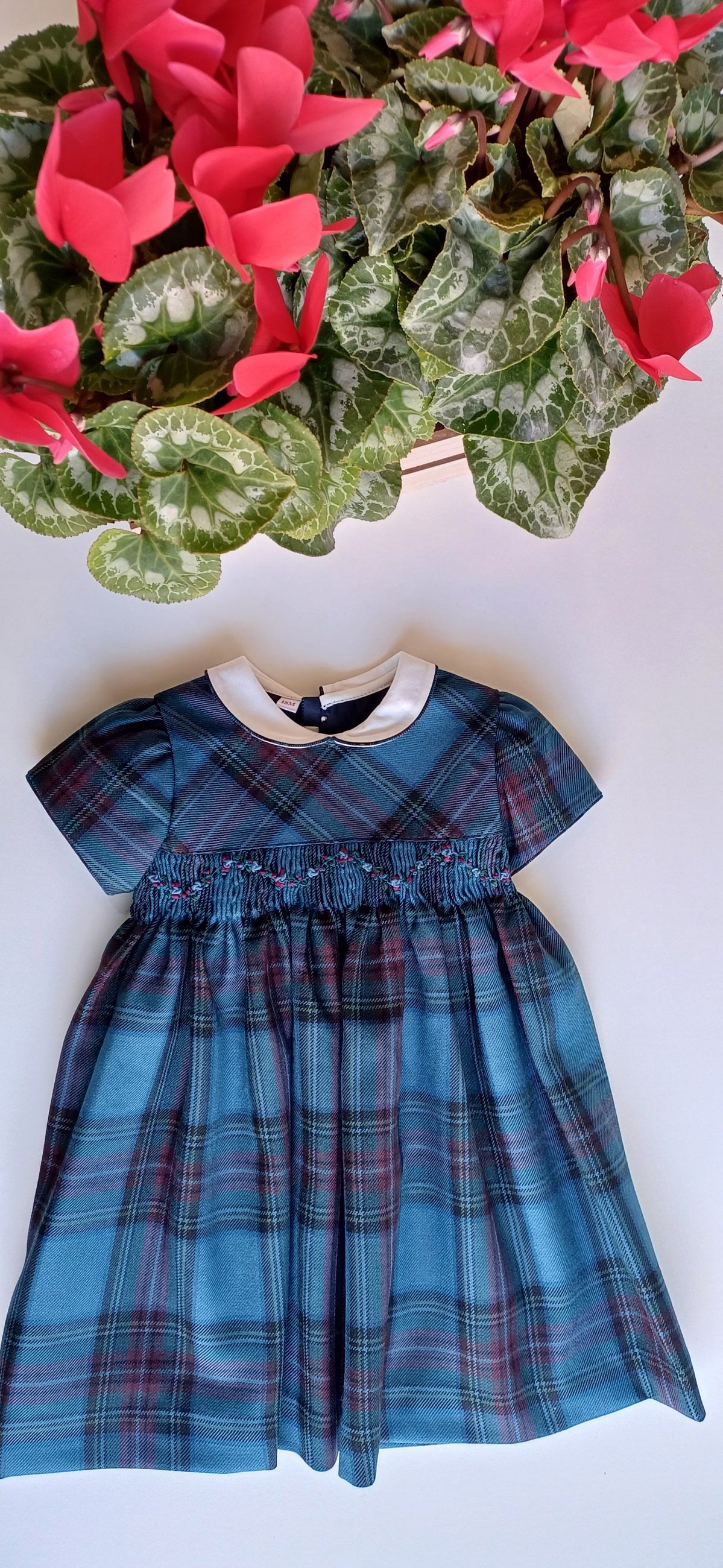 Abito in tartan color ottanio con punto smock,