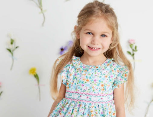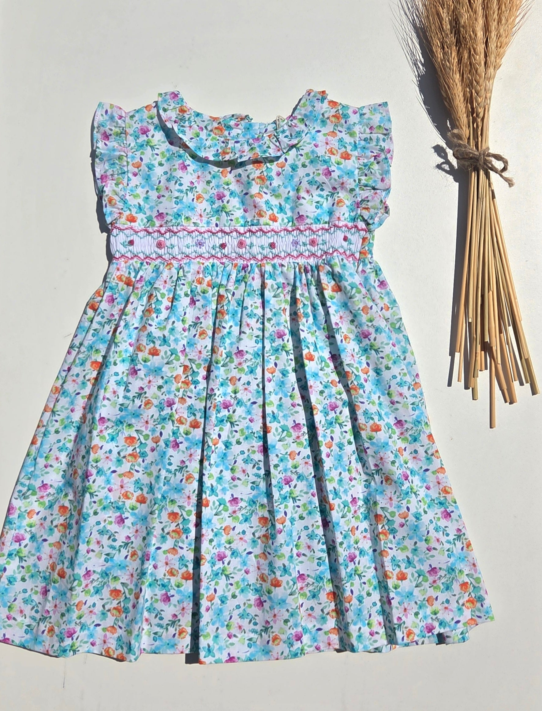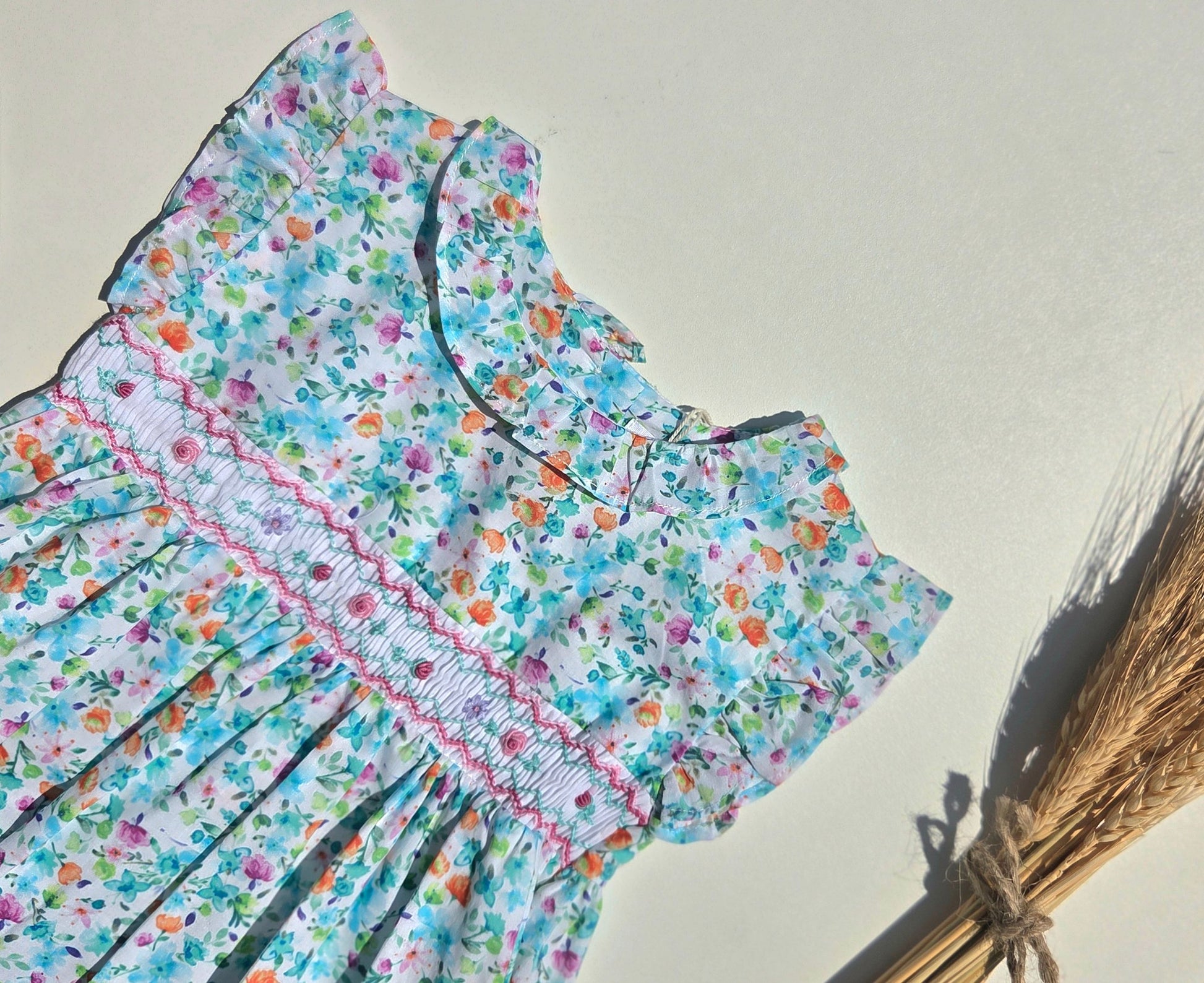 Abito motivo floreale in cotone leggerissimo con manica aletta e collo volant