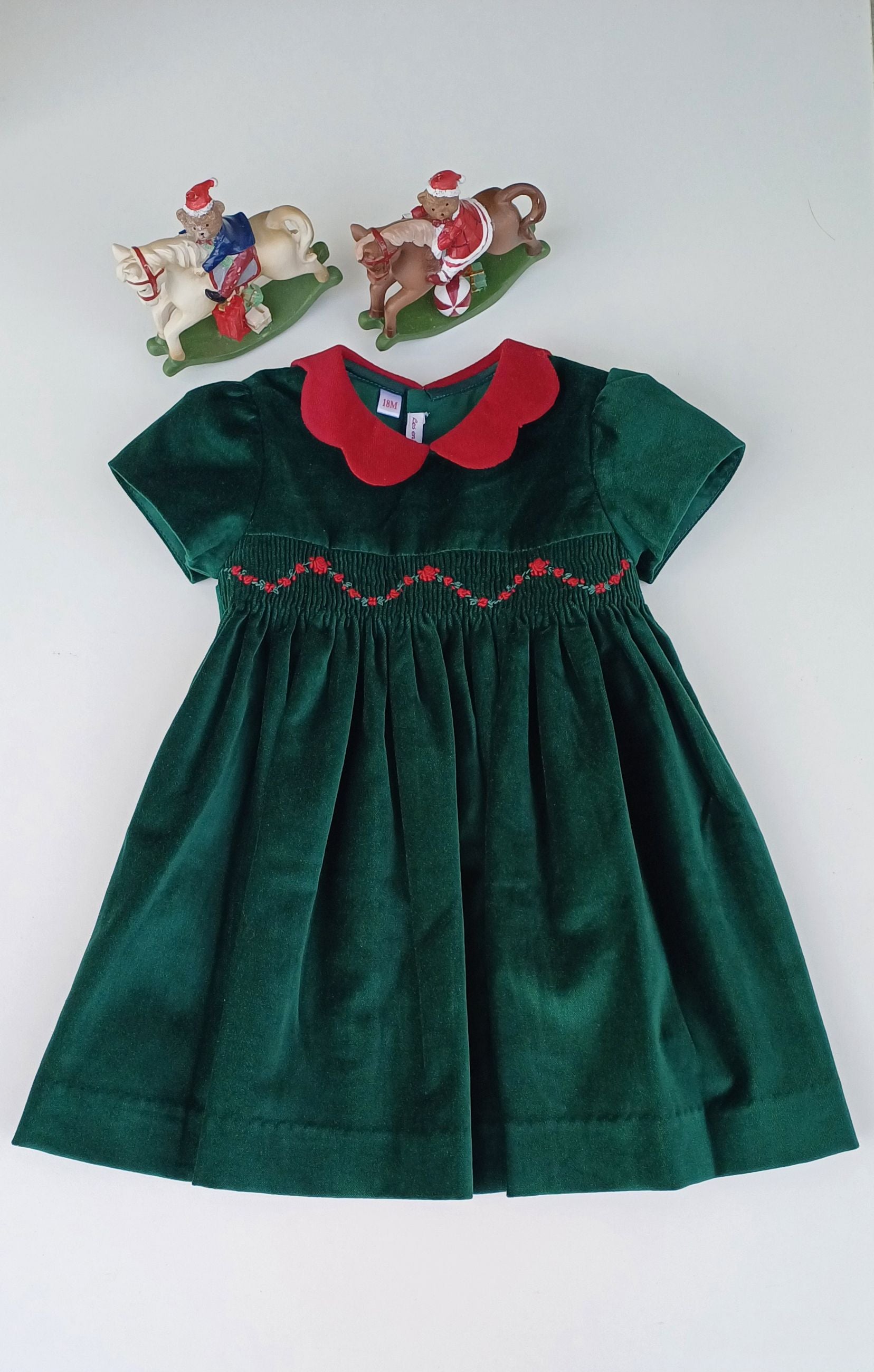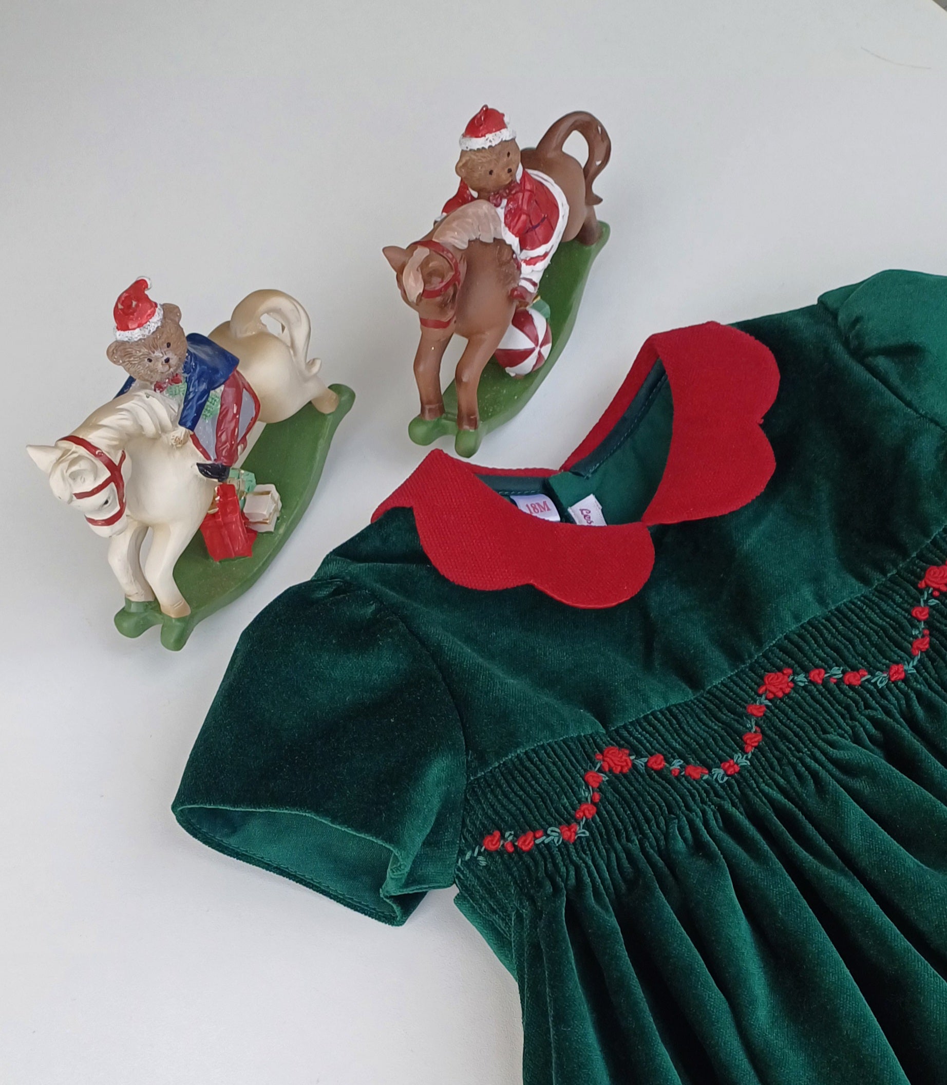 Abito in velluto verde con punto smock. Colletto smerlato in velluto rosso. Apertura sul retro con bottoni in madre perla.