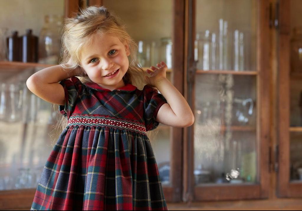 Abito in flanella fantasia tartan con collo in velluto rosso e punto smock.