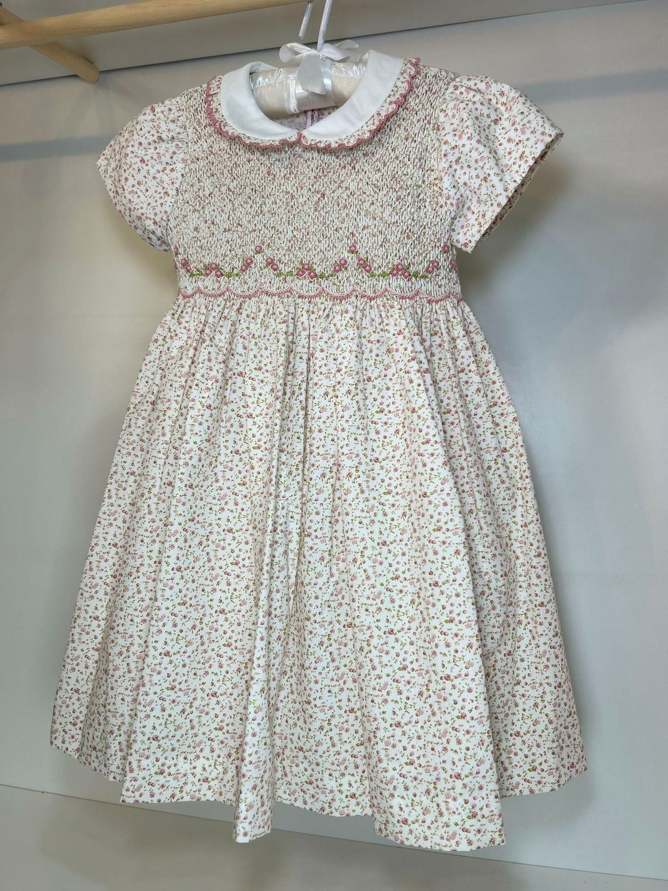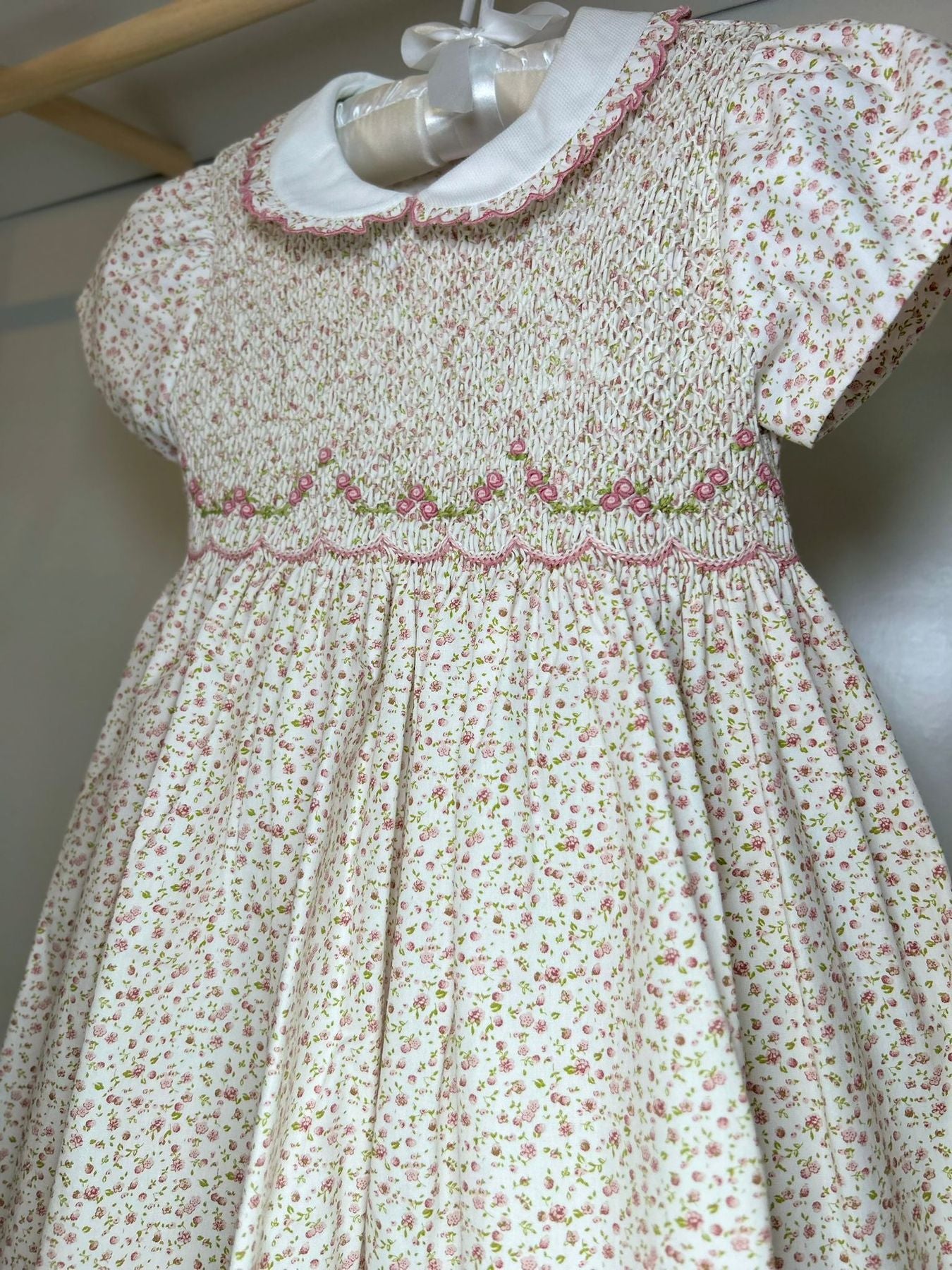 Abito in morbido cotone con fantasia fiori. Punto smock ricamato a mano e colletto in piquè con profili ricamati