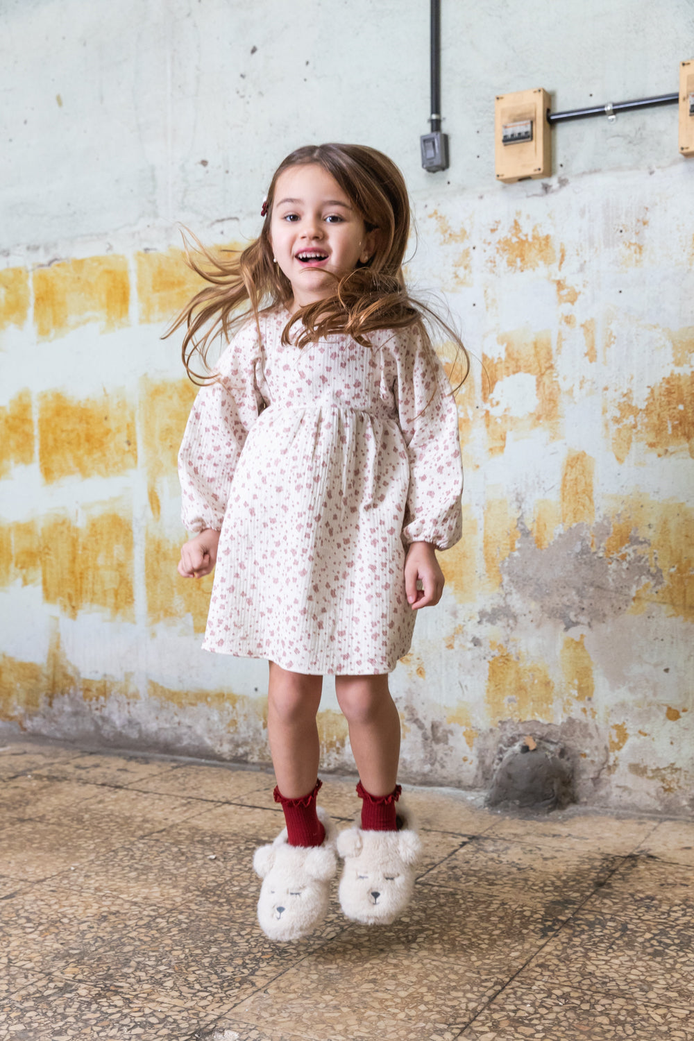 Abito in cotone foderato manica lunga con volant sulla spalla e chiusura sul retro con zip