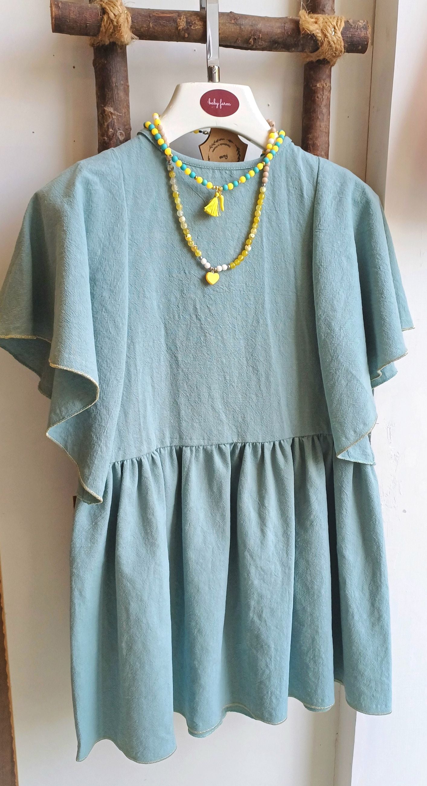 Abito in cotone e lino con elastico in vita e manica a campana. Presenta una rifinitura color oro lungo i profili di manica e orlo