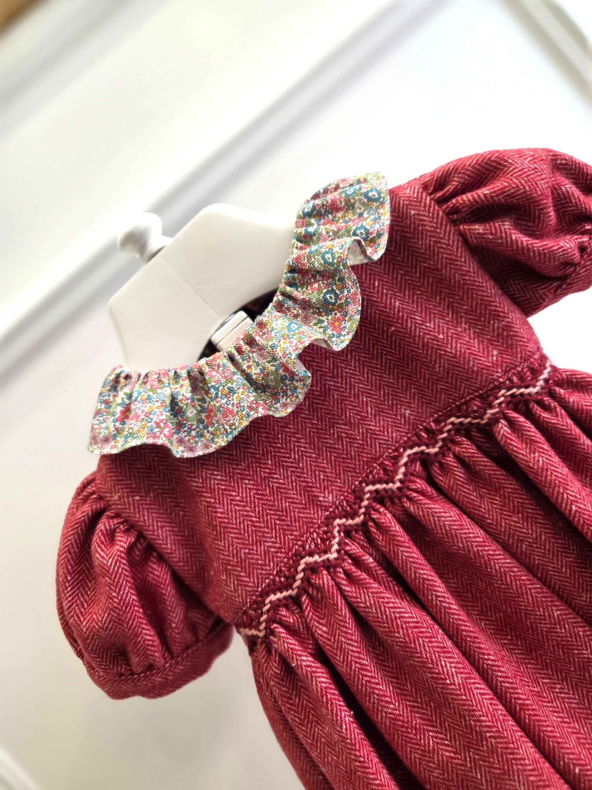 Abito mezza manica con punto smock realizzato a mano. Il tessuto è in lana fantasia spigata foderato in cotone. Il collo volant è in contrasto fantasia a fiorellini. Abbottonatura sul retro con bottoni e cinta.