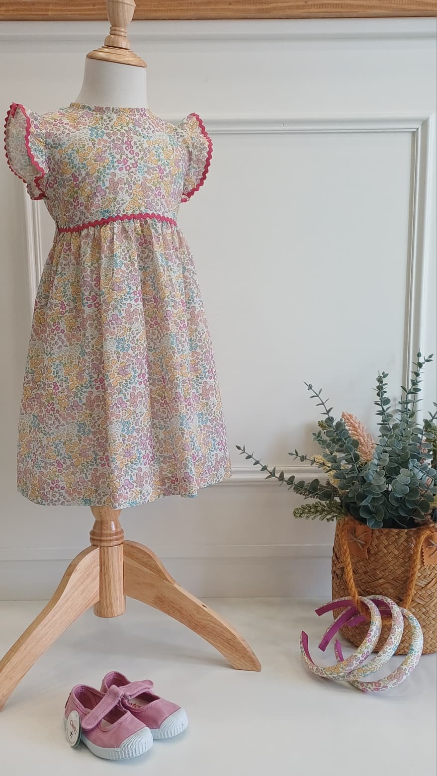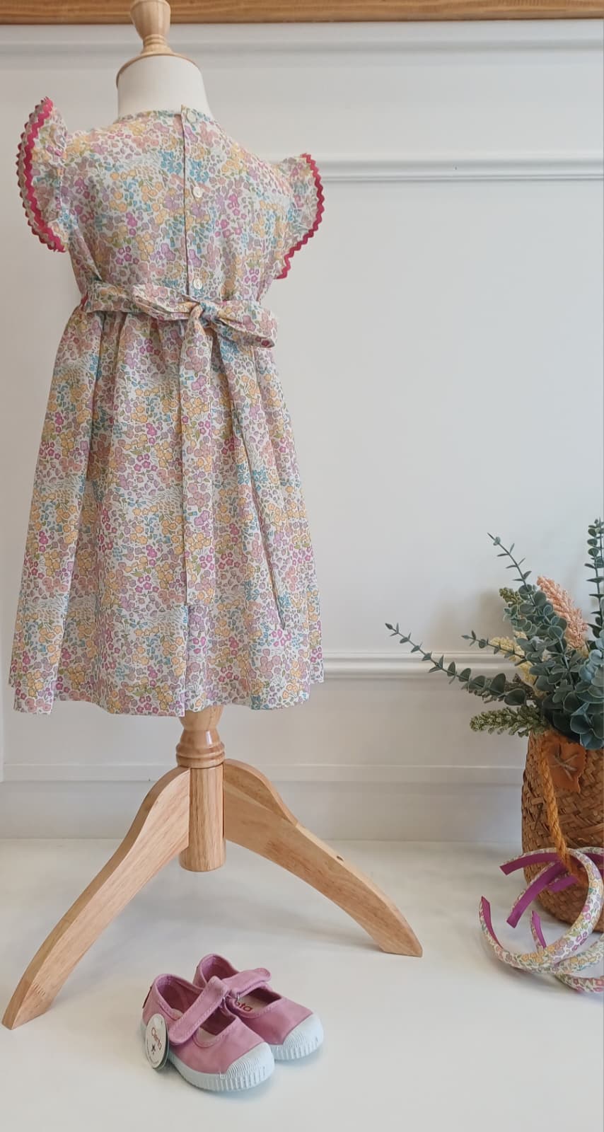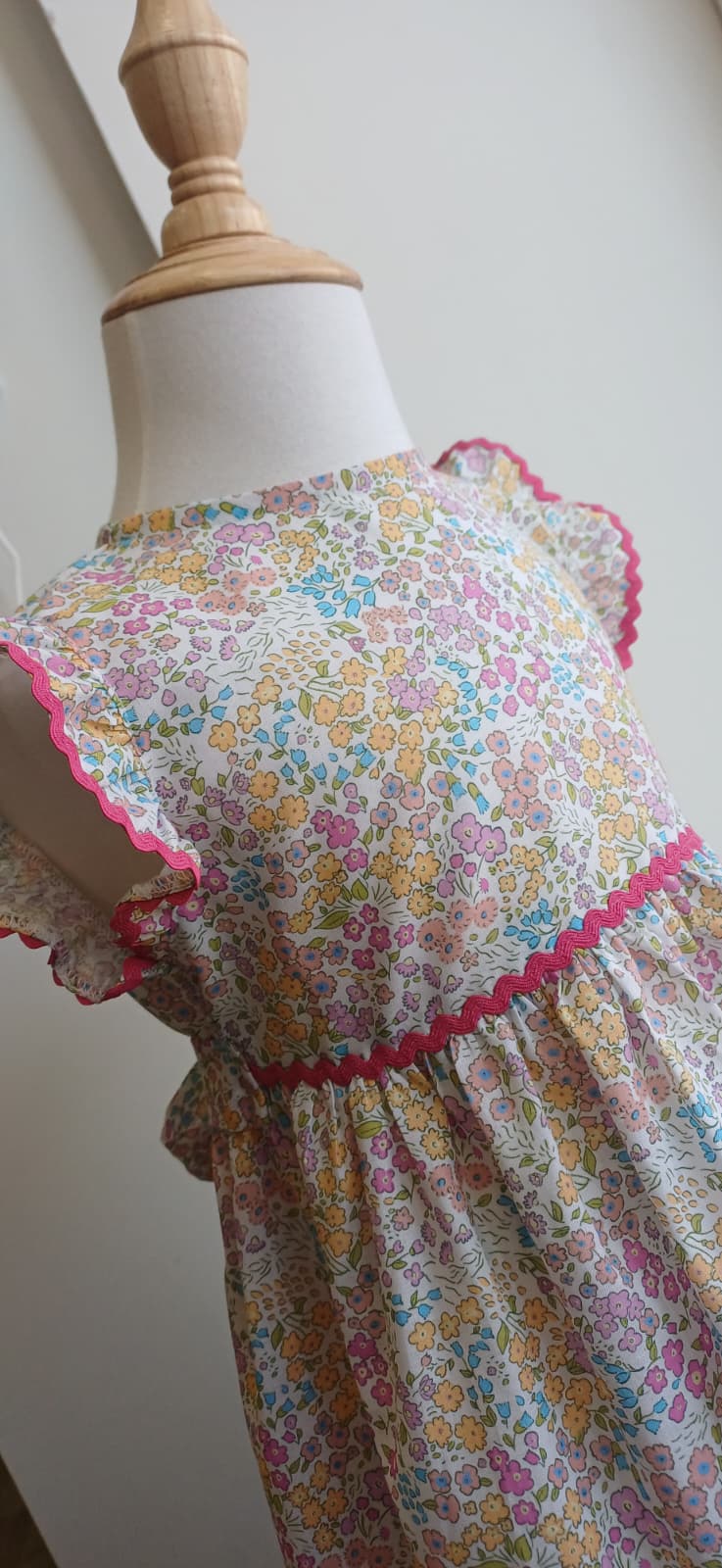 Abito in cotone leggerissimo fantasia floreale con profili spighetta su maniche volant e in vita