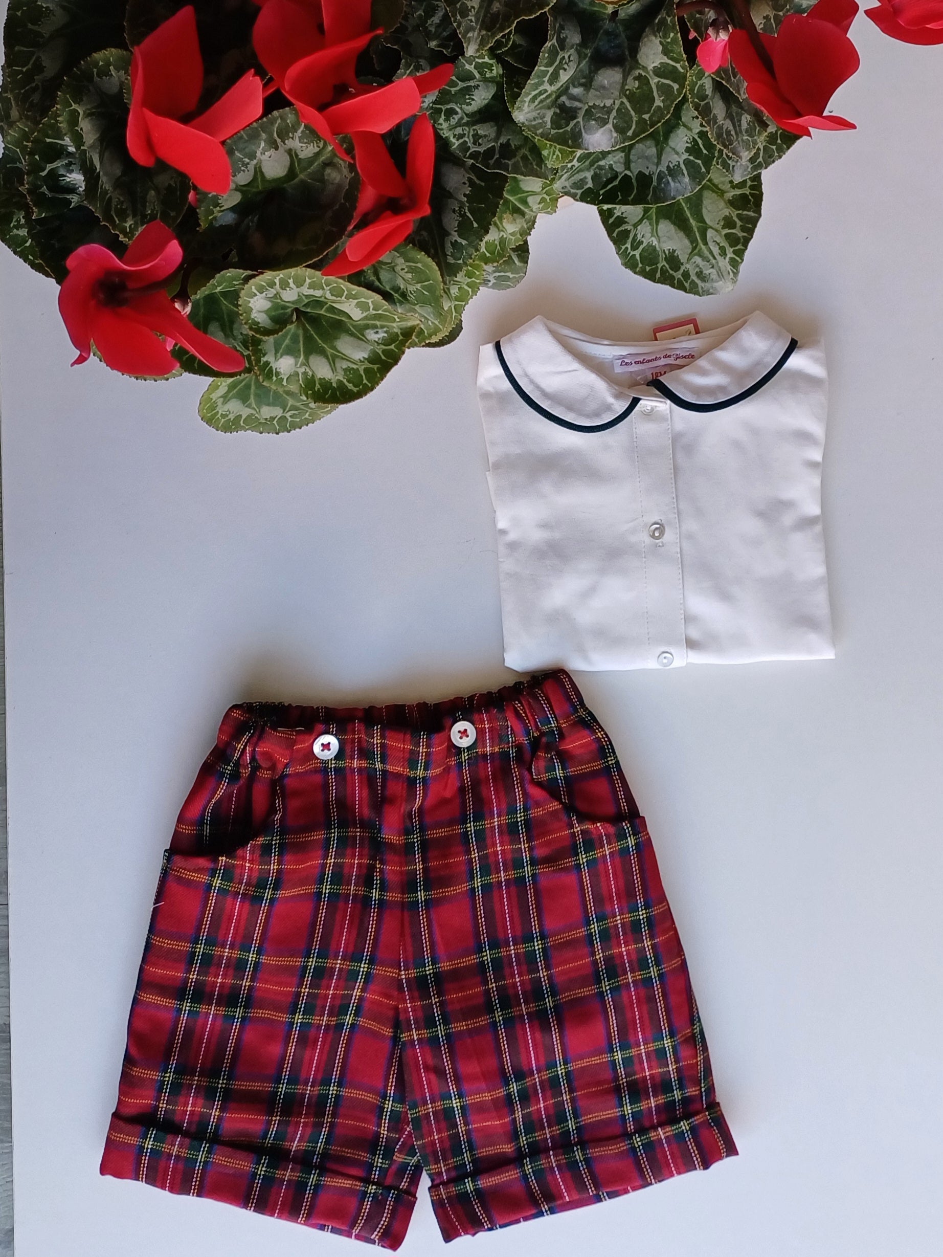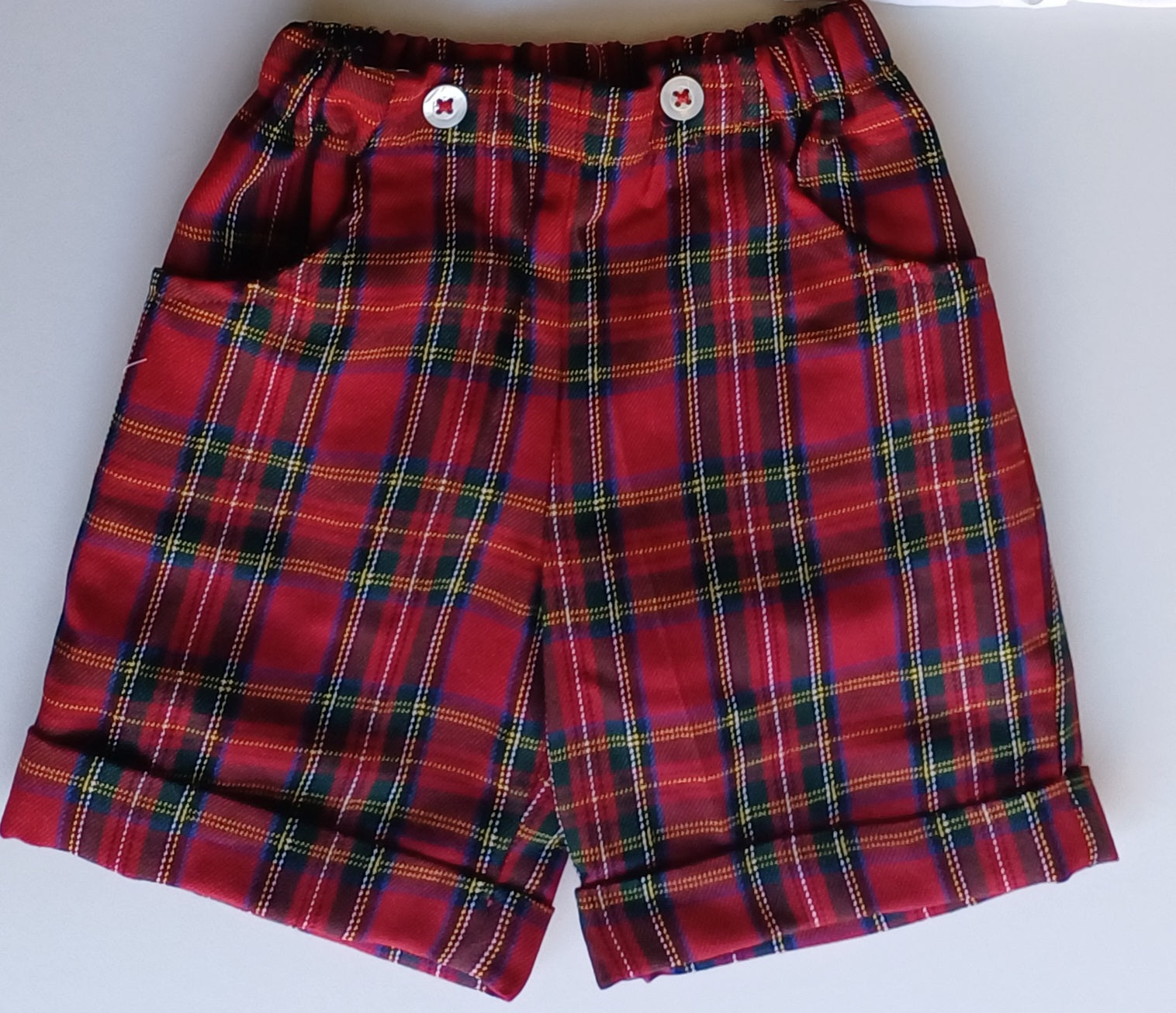 Bermuda stile inglese in tartan rosso. Elastico in vita e due bottoncini in madreperla decorativi sul davanti. 100% Lana