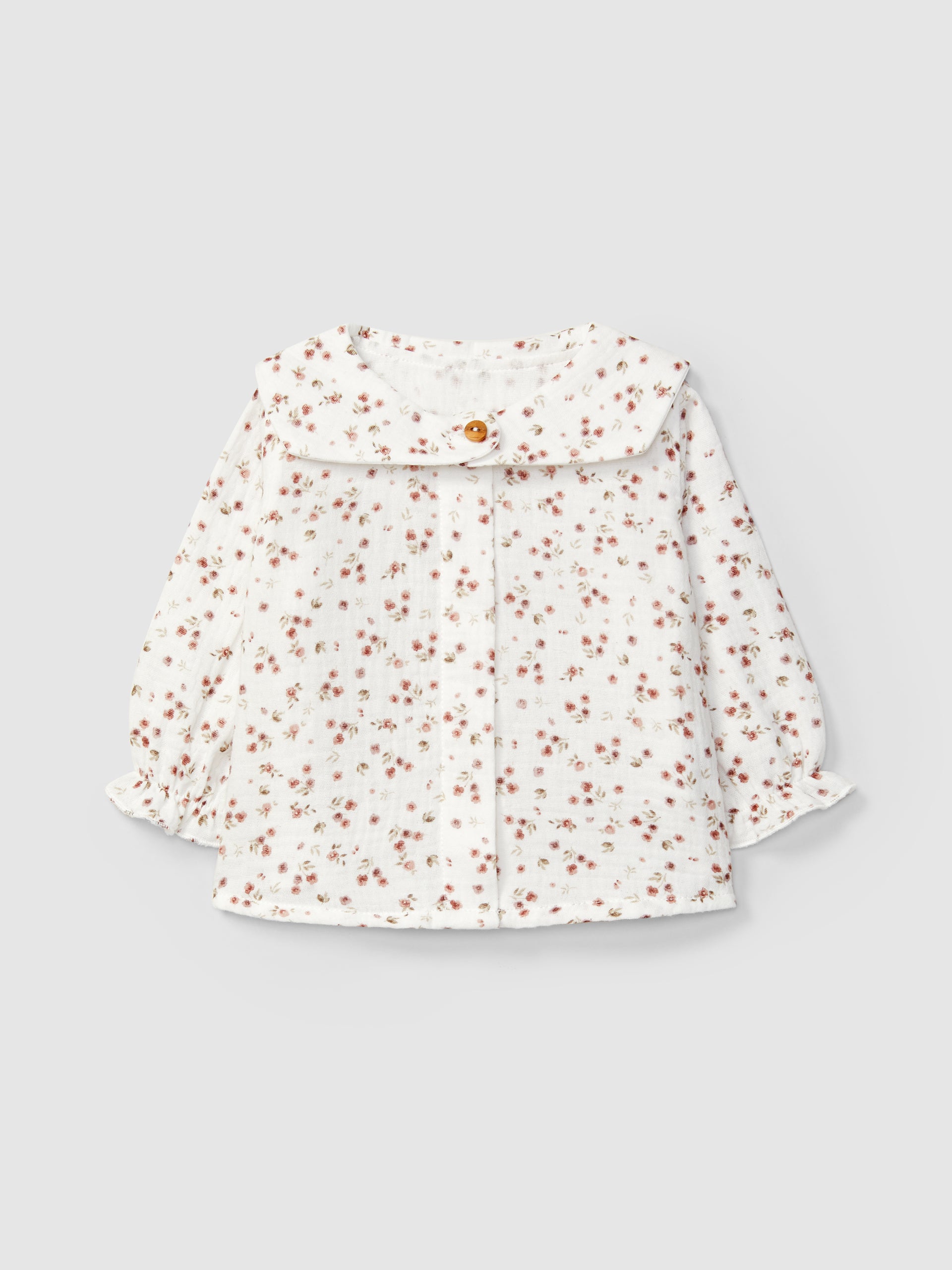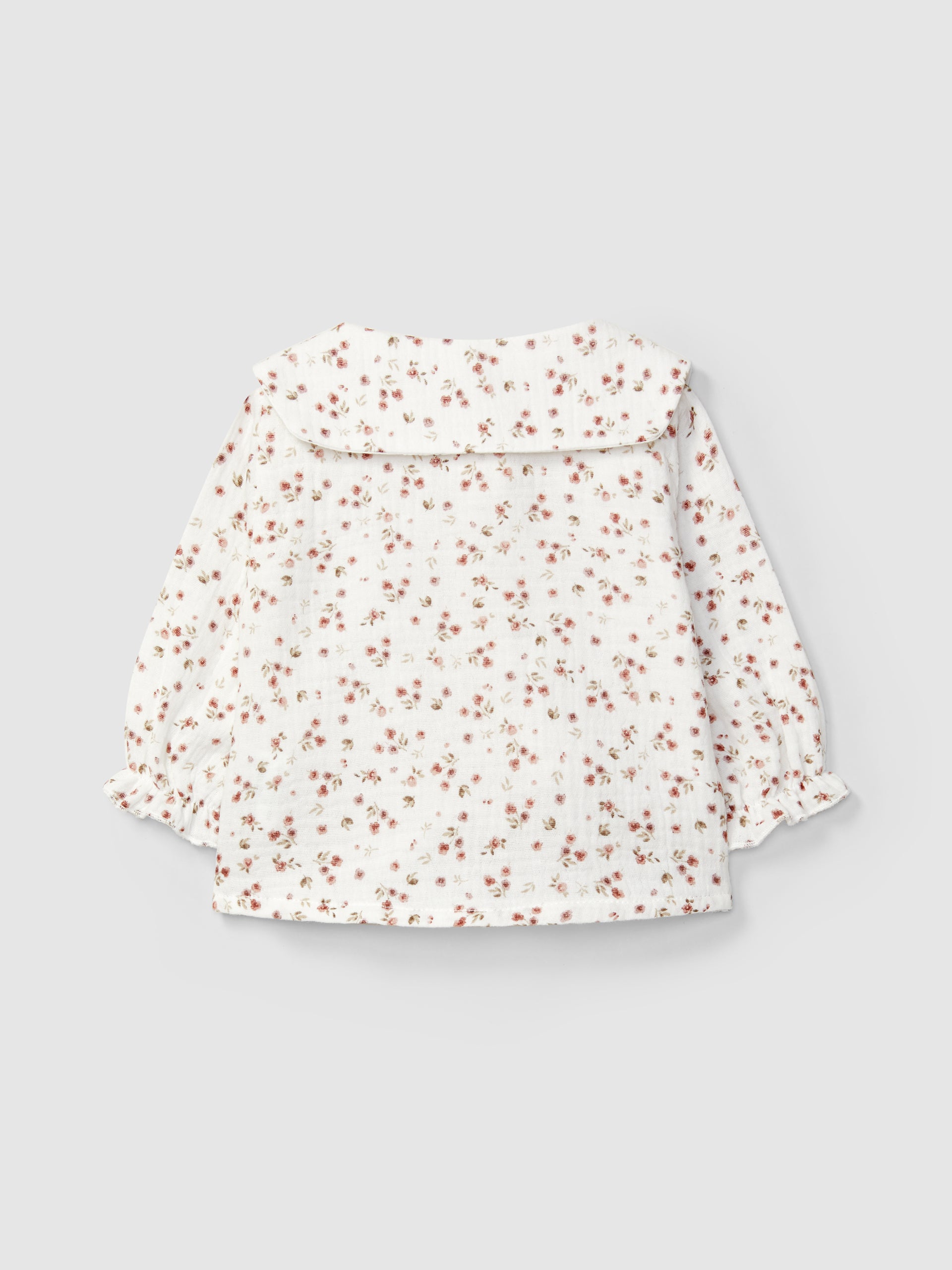 Camicetta in 100% mussola con stampa floreale. Chiusura con bottone in legno sul colletto e bottoni automatici nascosti a tutta lunghezza sul davanti.