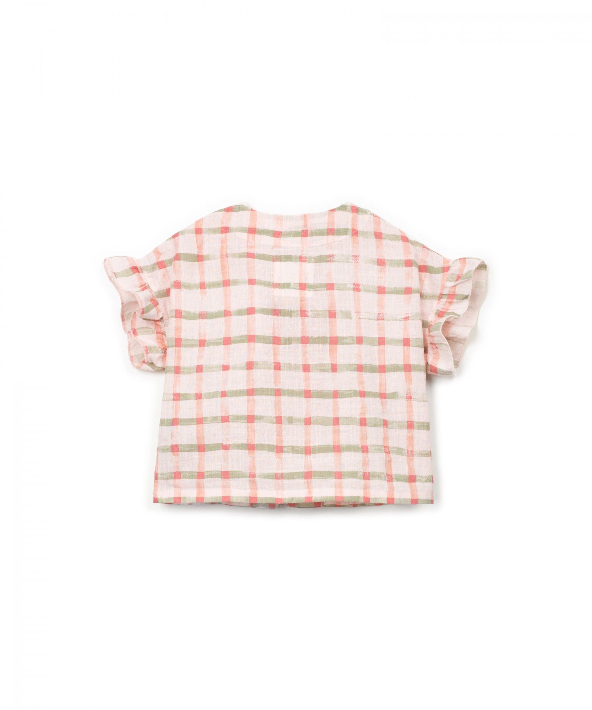 Questa camicia è realizzata in tessuto di cotone biologico, colore Rosa Chiaro. È un modello a manica corta con inserto con volant, apertura frontale con fiocchi e il nostro motivo a quadri.