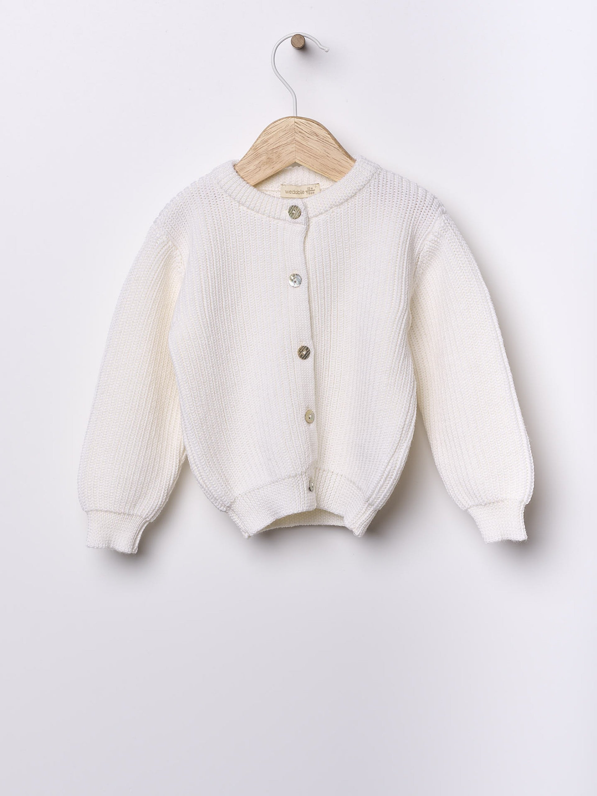 Cardigan a maniche lunghe lavorato a maglia in morbida lana merino, perfetto per bambini e bambine fino a 6 anni. Il cardigan HAPPY GIRL si chiude sul davanti con bottoni in madreperla.