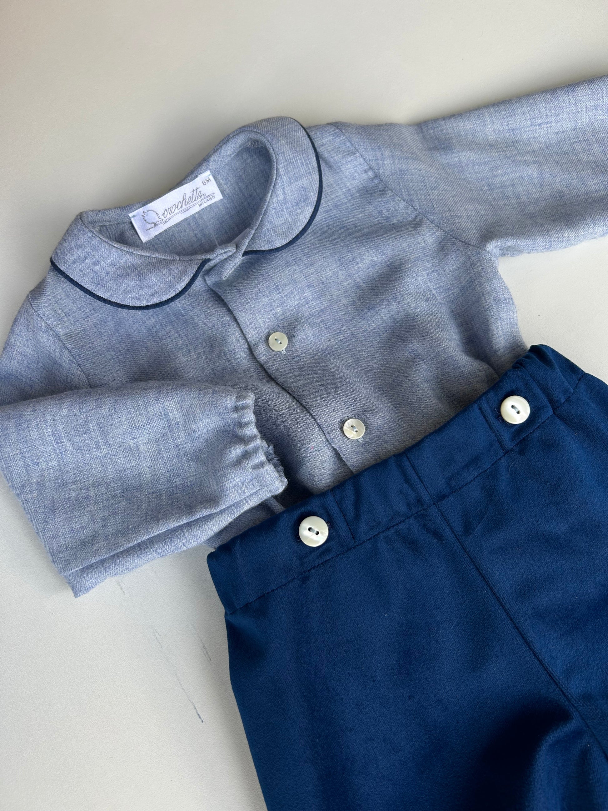 Completo pantalone in velluto blu e camicia azzurra chambrè con profili sul colletto in tinta con il pantaloncino. Presenta in vita bottoni in madreperla così come sulla camicia