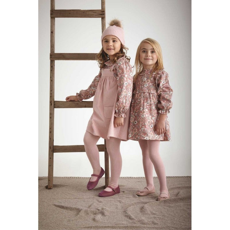 Salopette in velluto a coste rosa antico con camicia a fiori con collo ruches in cotone manica lunga. Polsino con elastico