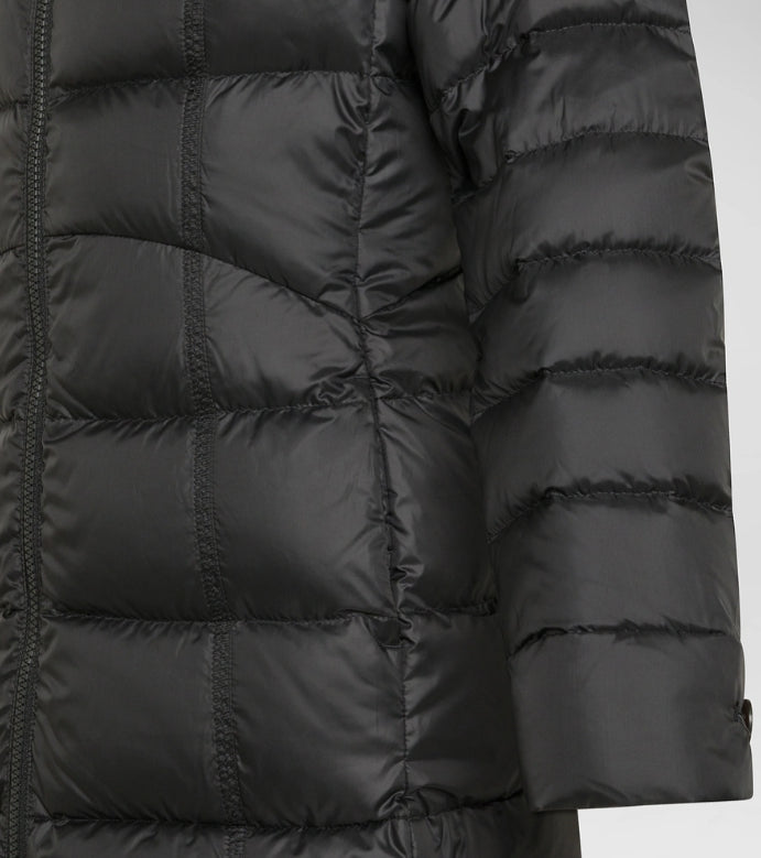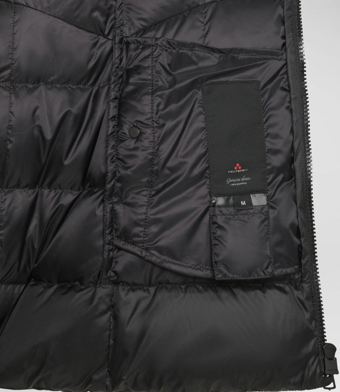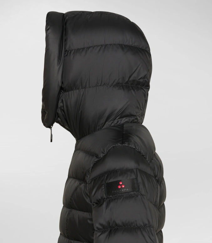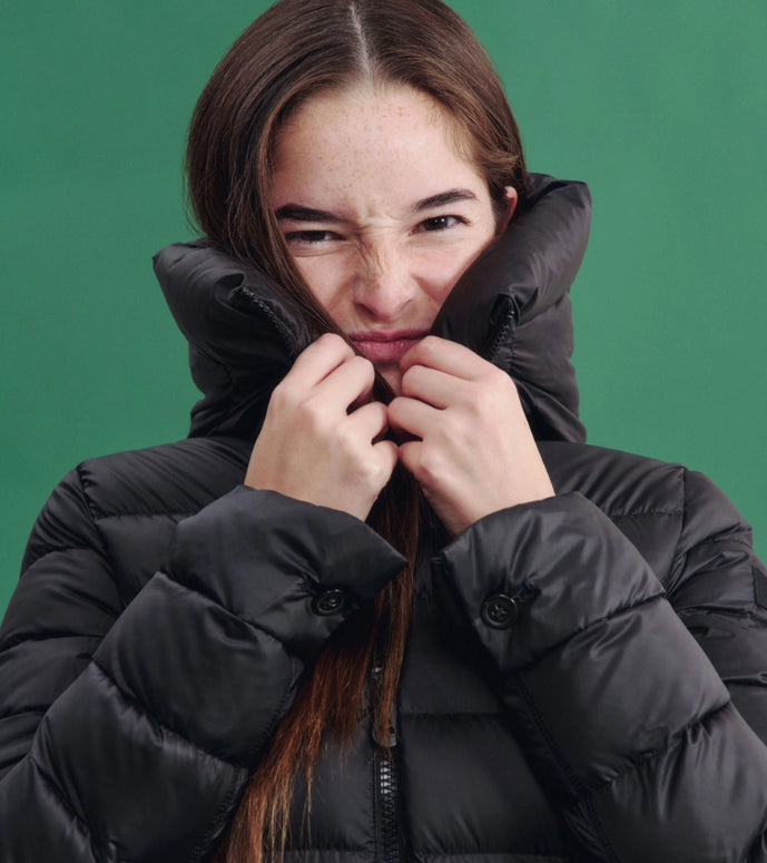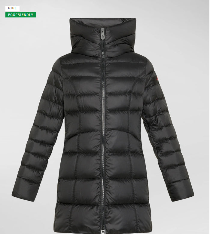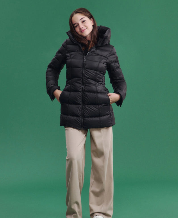 Avvolgente piumino composto da tela bi-stretch di nylon unita ad un morbido pile interno che rende il capo caldo e confortevole, con imbottitura in soffice piuma naturale certificata. Arricchito da un ampio collo in piedi con cappuccio fisso. Full zip centrale con doppio cursore. Fit avvitato ed elegante. Stile sofisticato e versatile, pensato per accompagnare le più giovani nelle sfide di tutti i giorni con eleganza e determinazione.