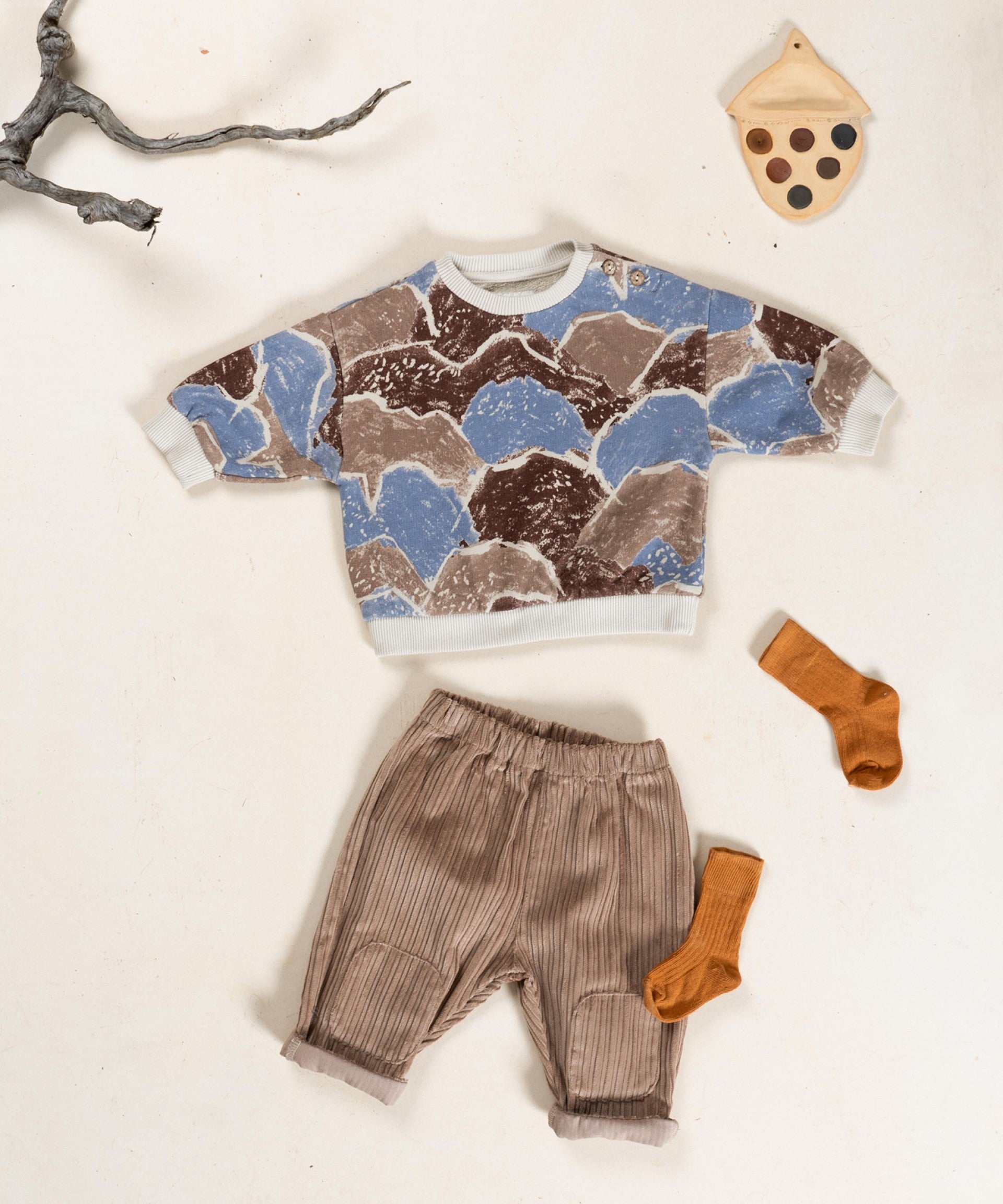 Questa maglia è realizzata in tessuto lavorato a maglia con una miscela di cotone biologico e cotone, nel colore Grezzo Chiaro. È un modello a manica lunga, con scollo rotondo, apertura sulla spalla con bottoni in cocco e il nostro stampato con motivi montani.