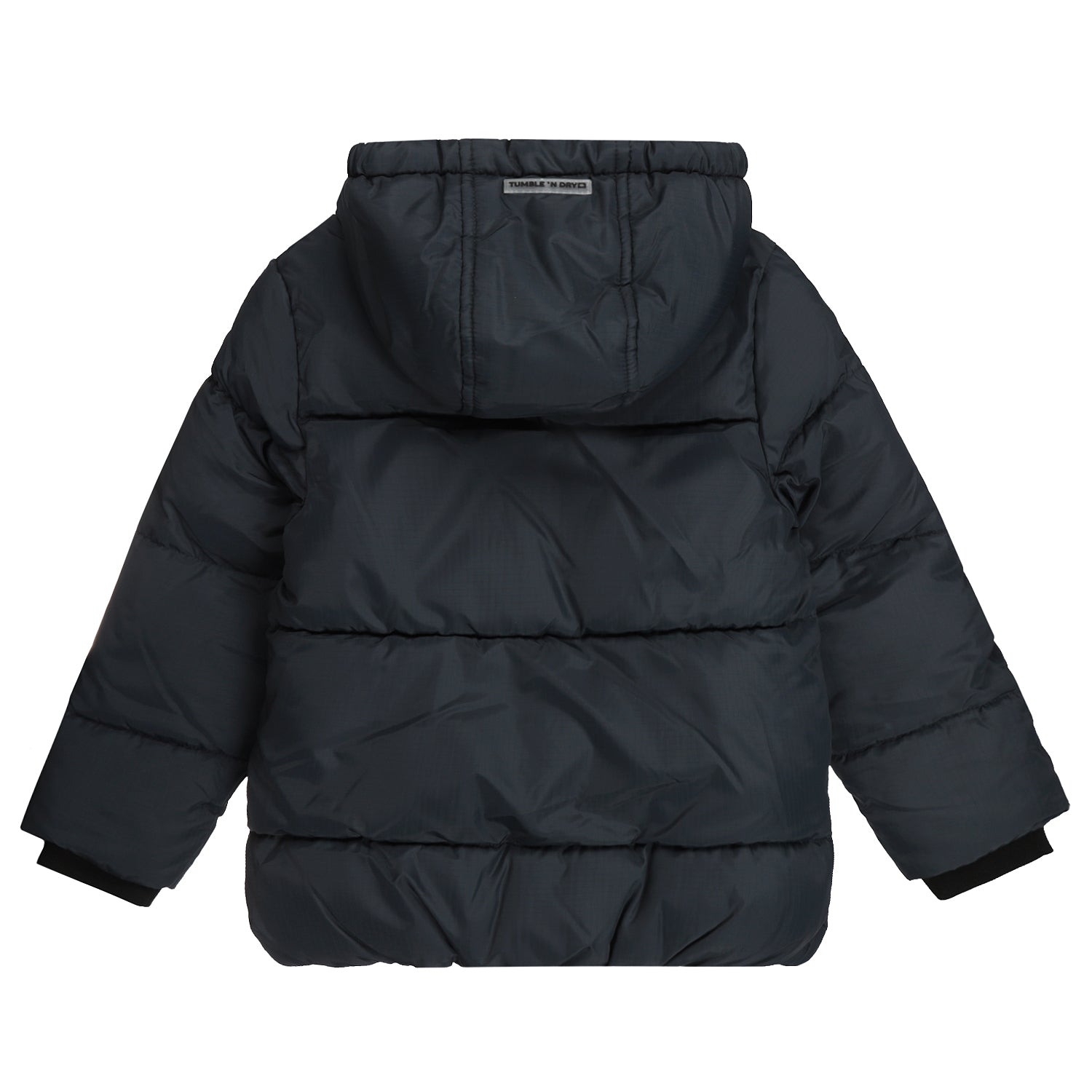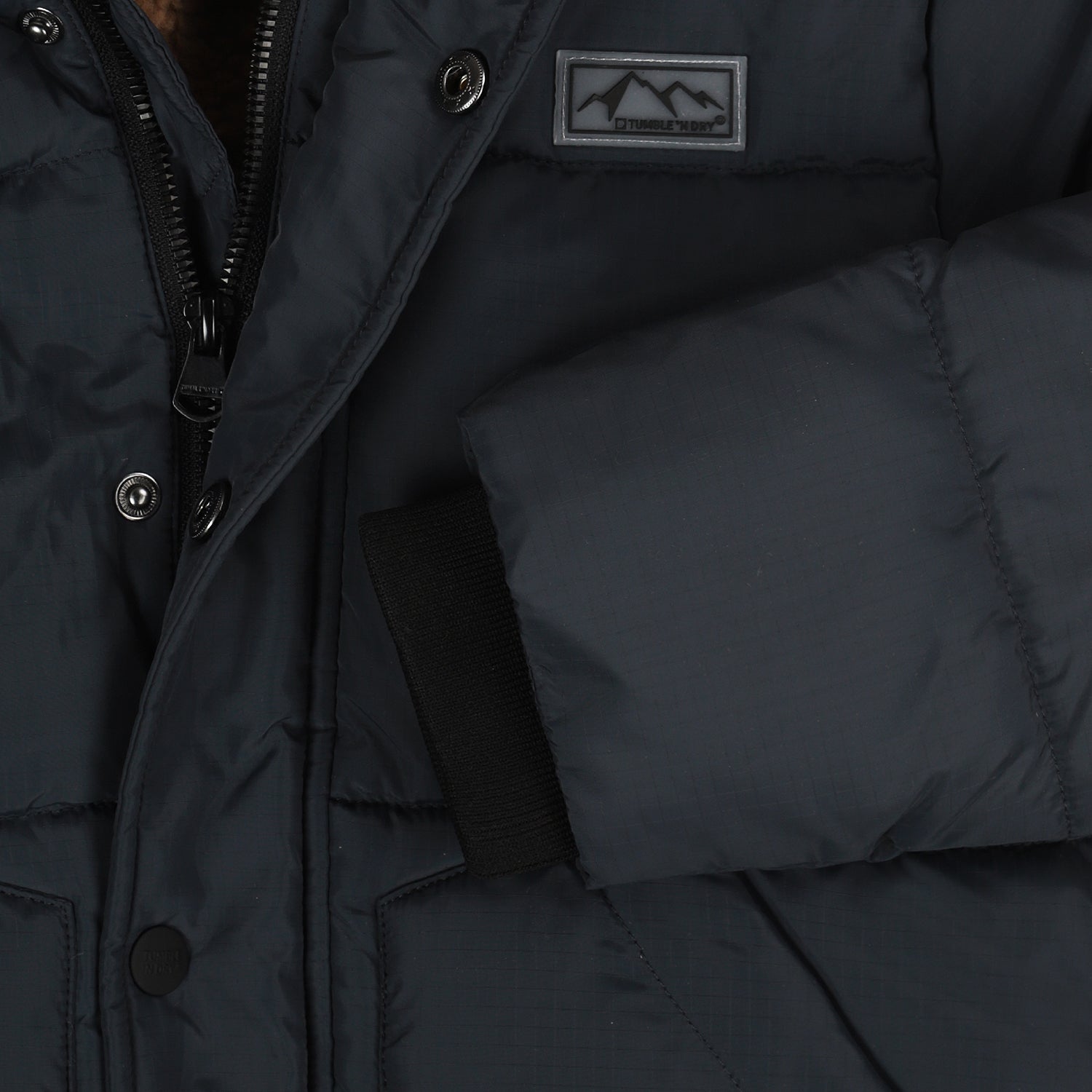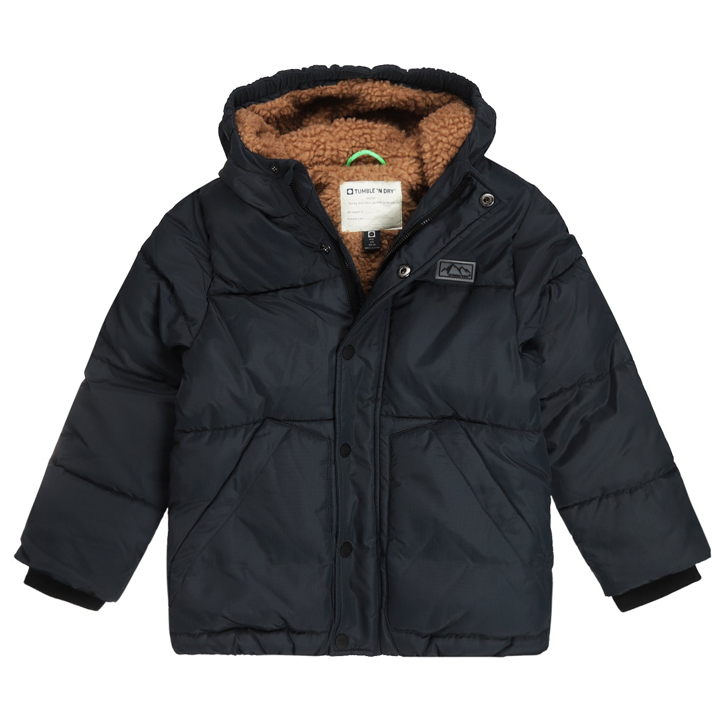 Giubbino impermeabile foderato in tessuto teddy anche nel cappuccio. Chiusura con bottoni e zip, polsini elastici antivento e tasche con clip