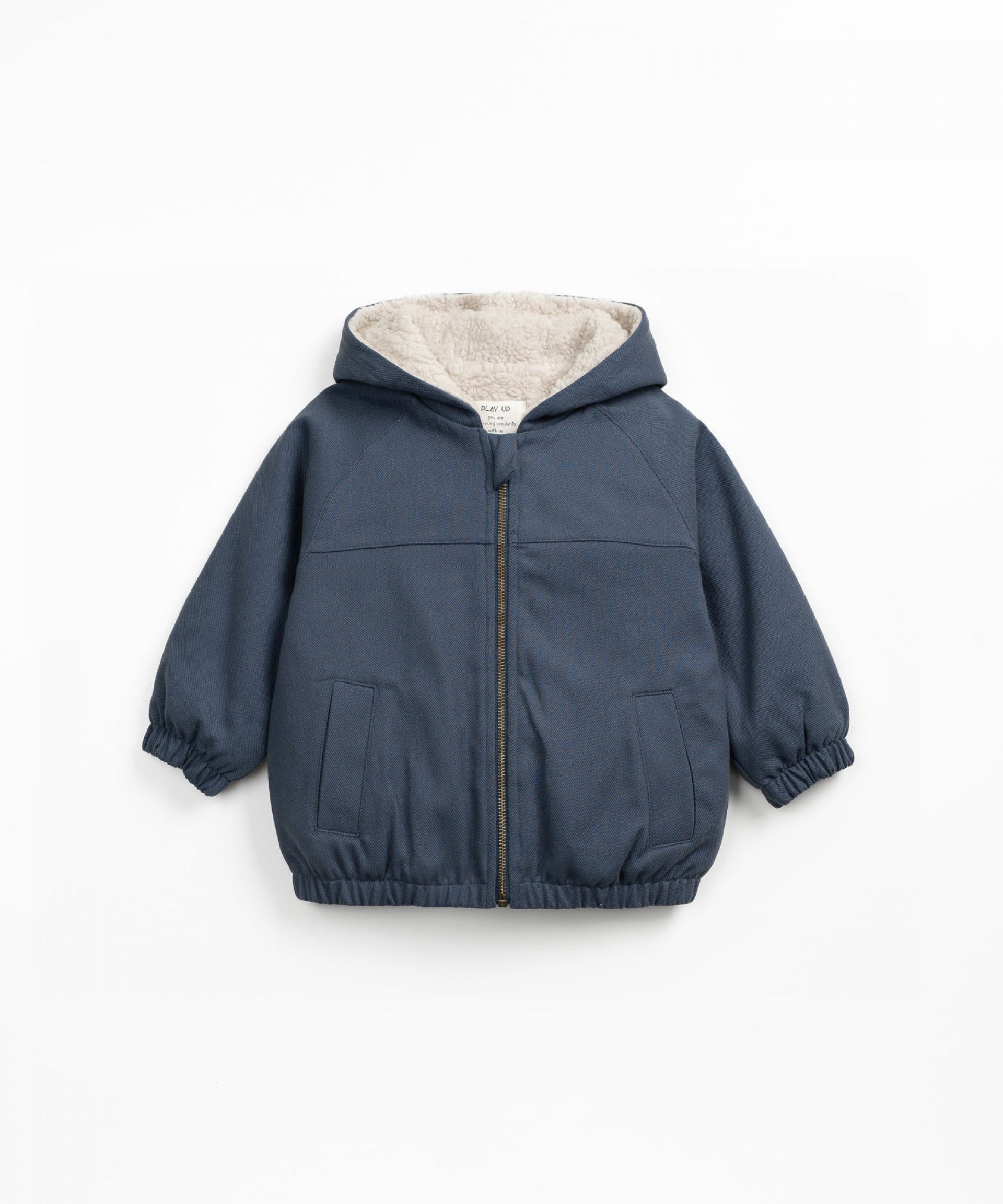 Questa giacca è realizzata in twill di cotone, nel colore Blu Scuro. È un modello con fodera in pelliccia di cotone biologico, con cappuccio, tasche, apertura frontale con cerniera, cintura applicata, polsini elasticizzati e finitura idrorepellente.