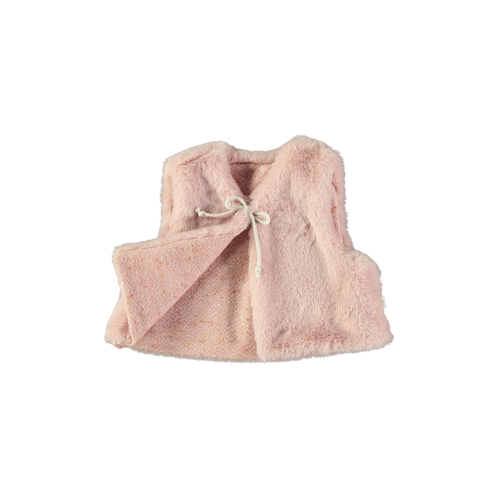 Gilet double face con un verso in eco pelliccia rosa e l'altro in flanella di cotone fantasia spiga