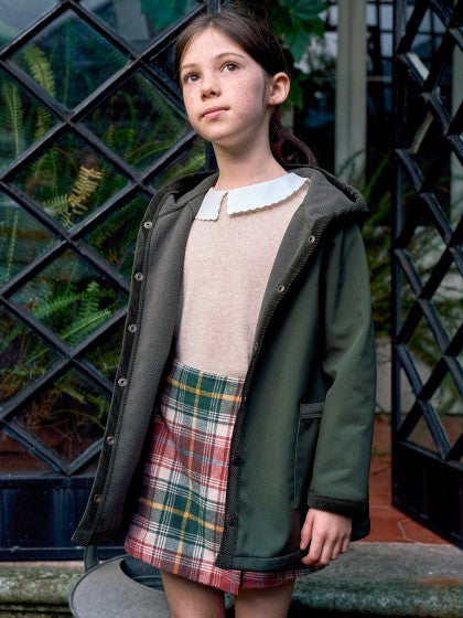 Gonna corta a quadri in flanella di cotone 100%, morbida e calda. Bottone decorativo in vita. Elastico interno regolabile in vita per una migliore vestibilità.