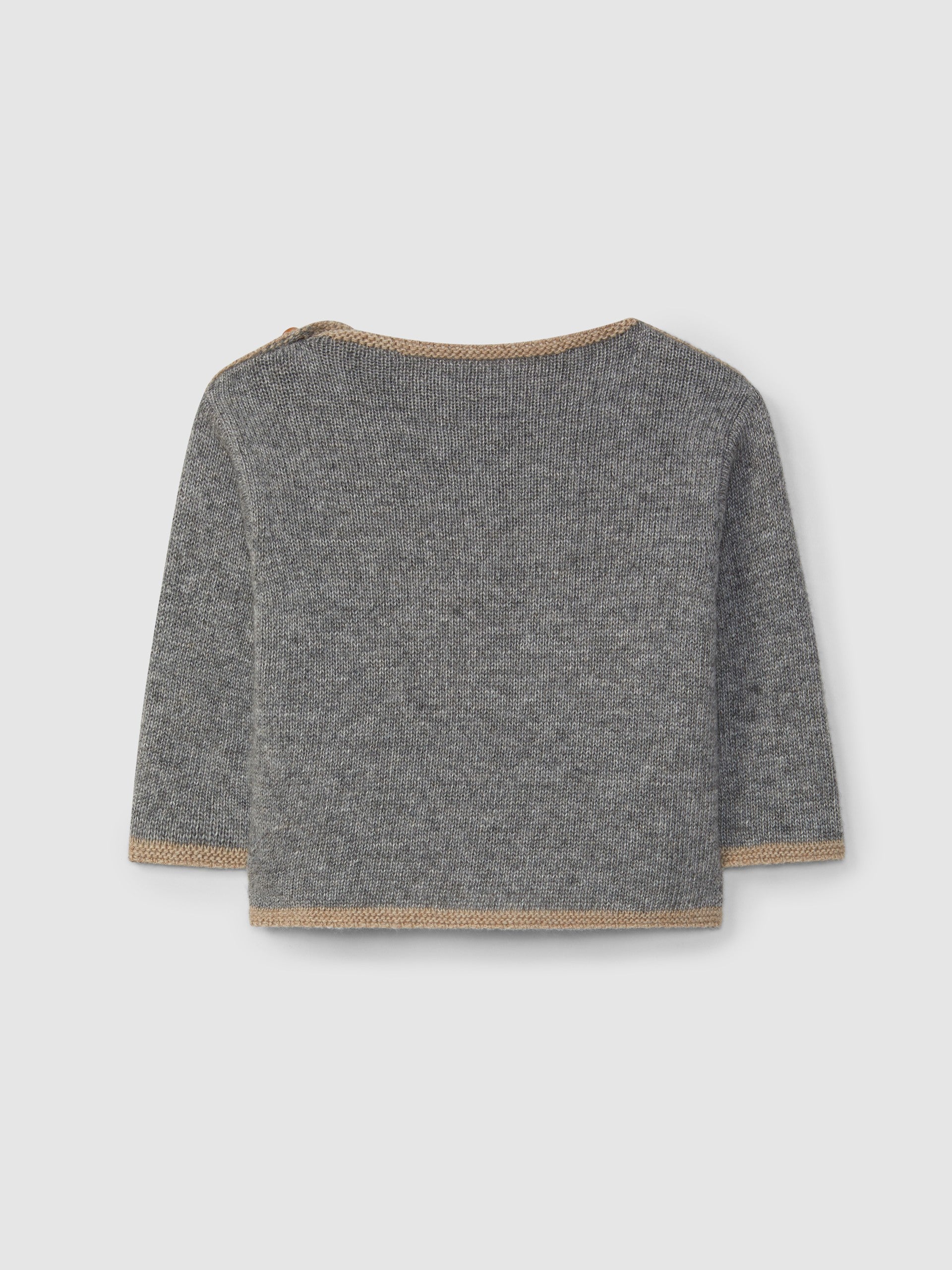 Maglione lavorato a maglia con scollo rotondo in lana merino, poliammide riciclata e un tocco di cashmere. Jacquard a forma di gatto con dettagli in rilievo. Chiusura con bottoni in legno sulla spalla fino a 18 mesi.