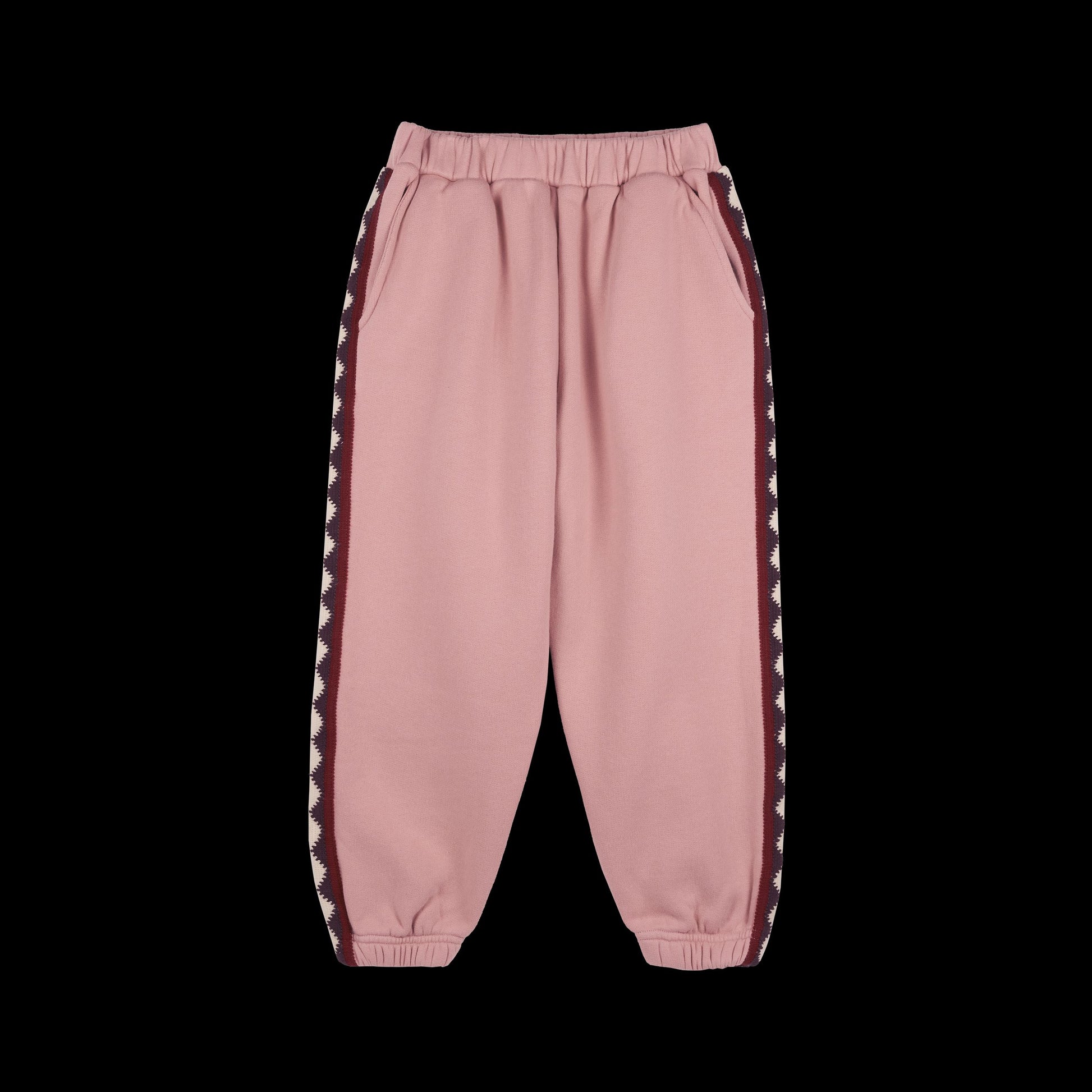 Pantalone in felpa calda rosa antico con elastico alla caviglia e passamaneria sulla gamba realizzata artigianalmente