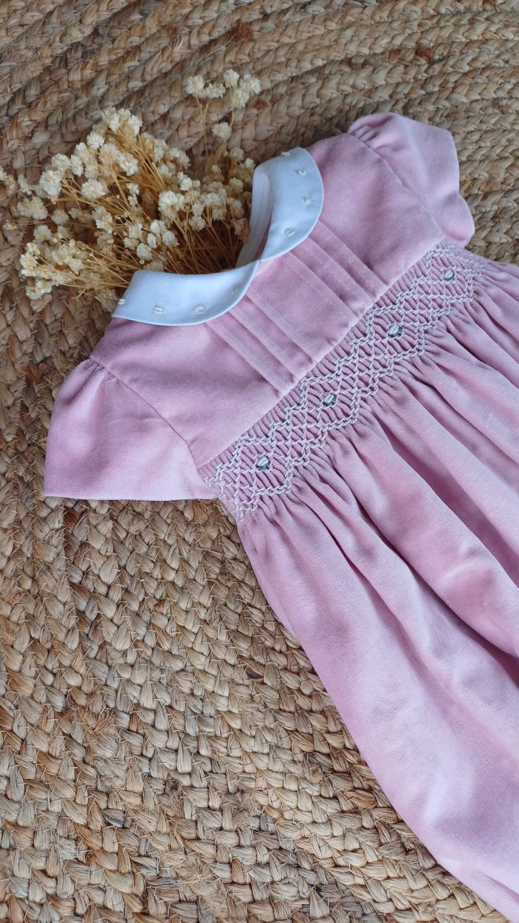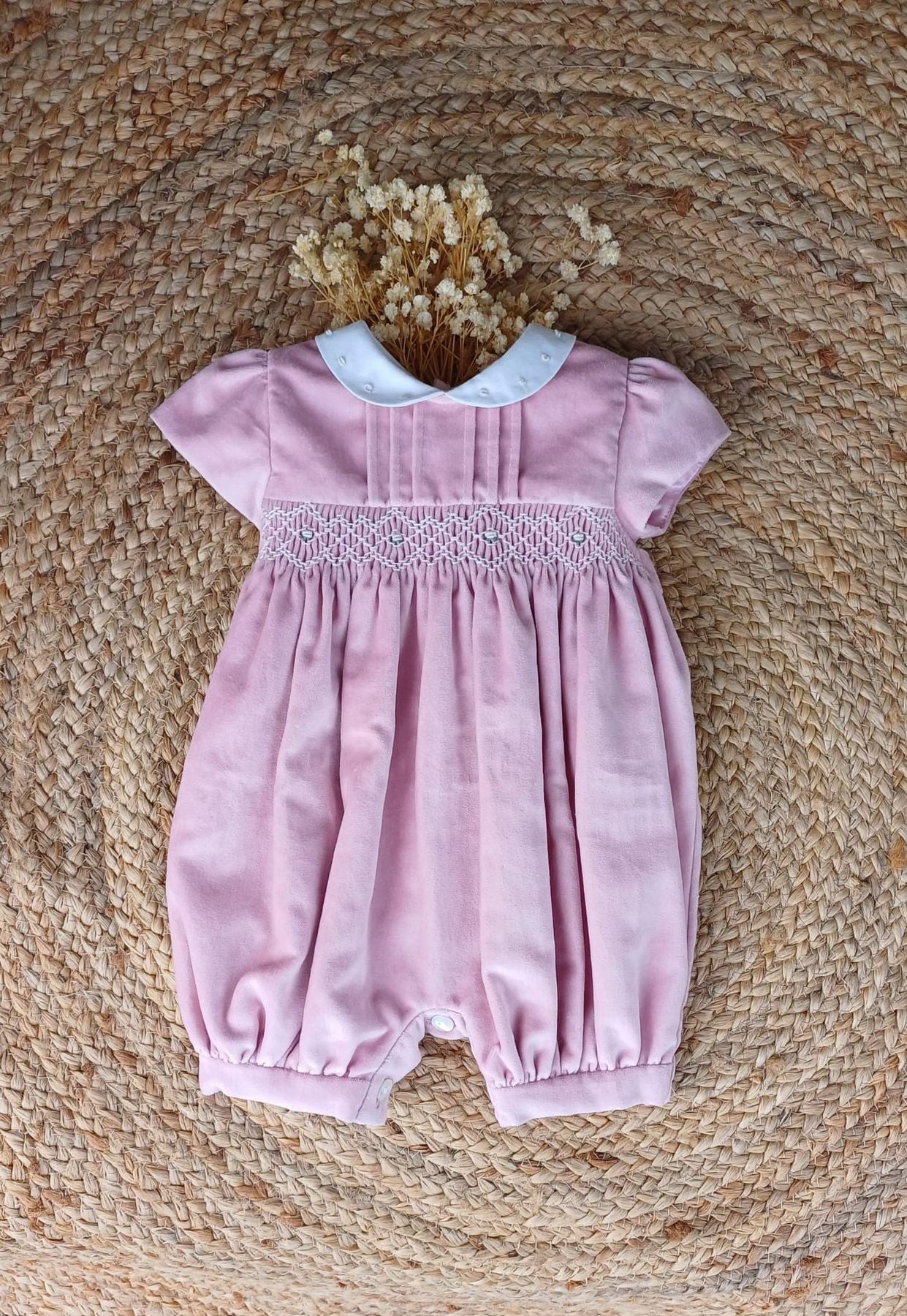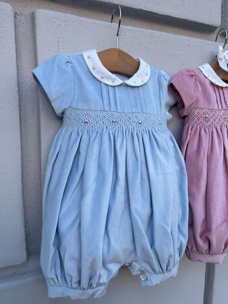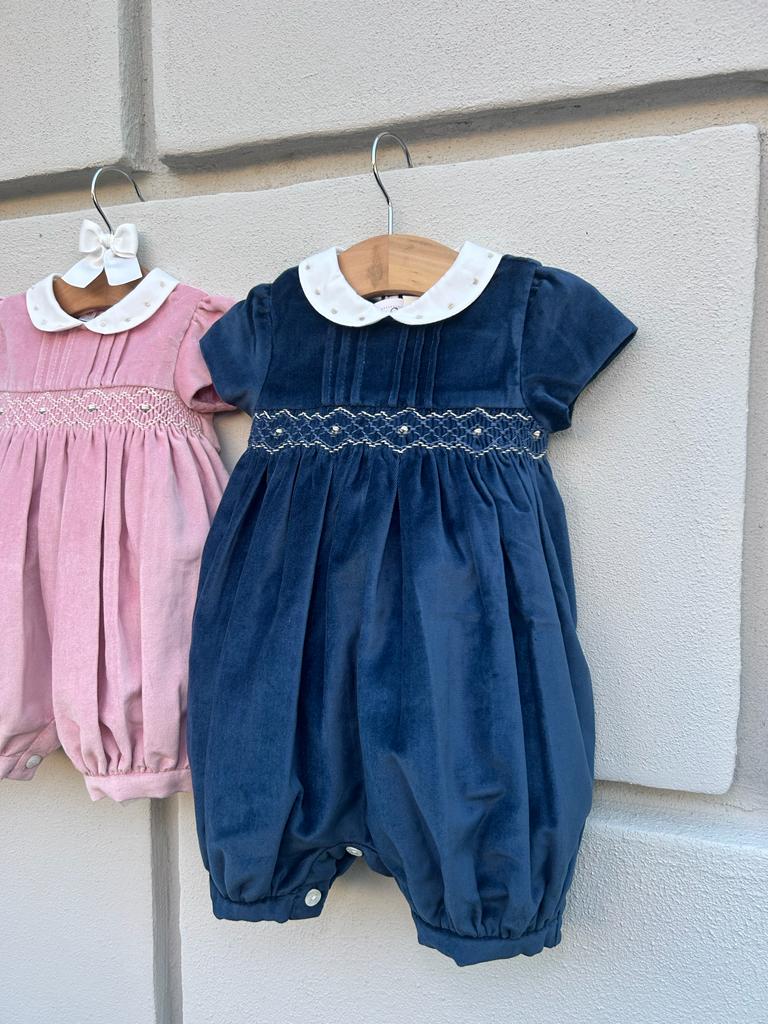 Pagliaccetto in velluto con punto smock e colletto in cotone bianco ricamato