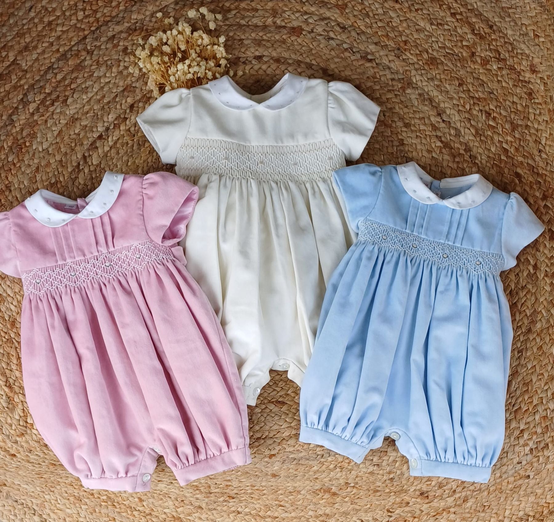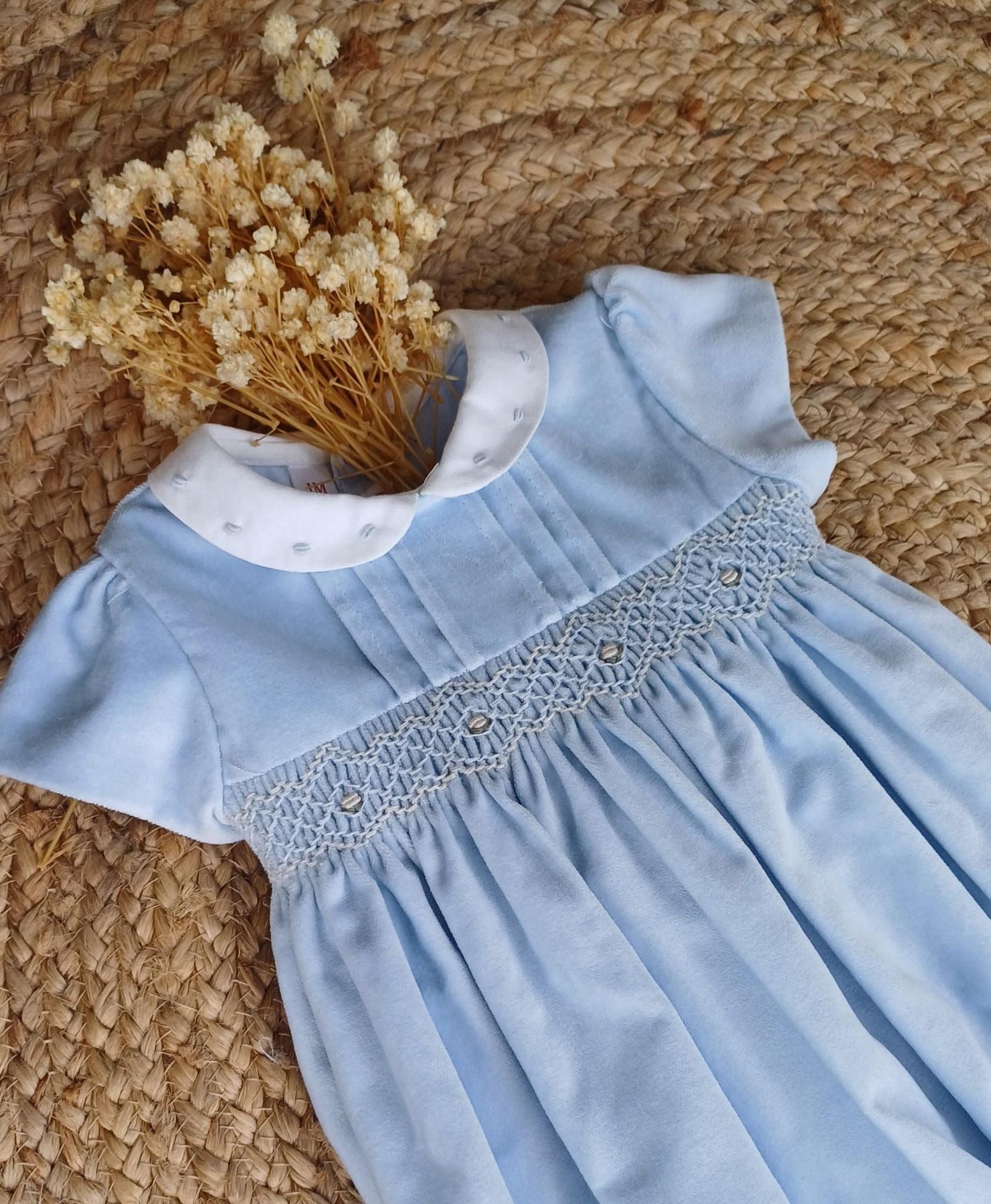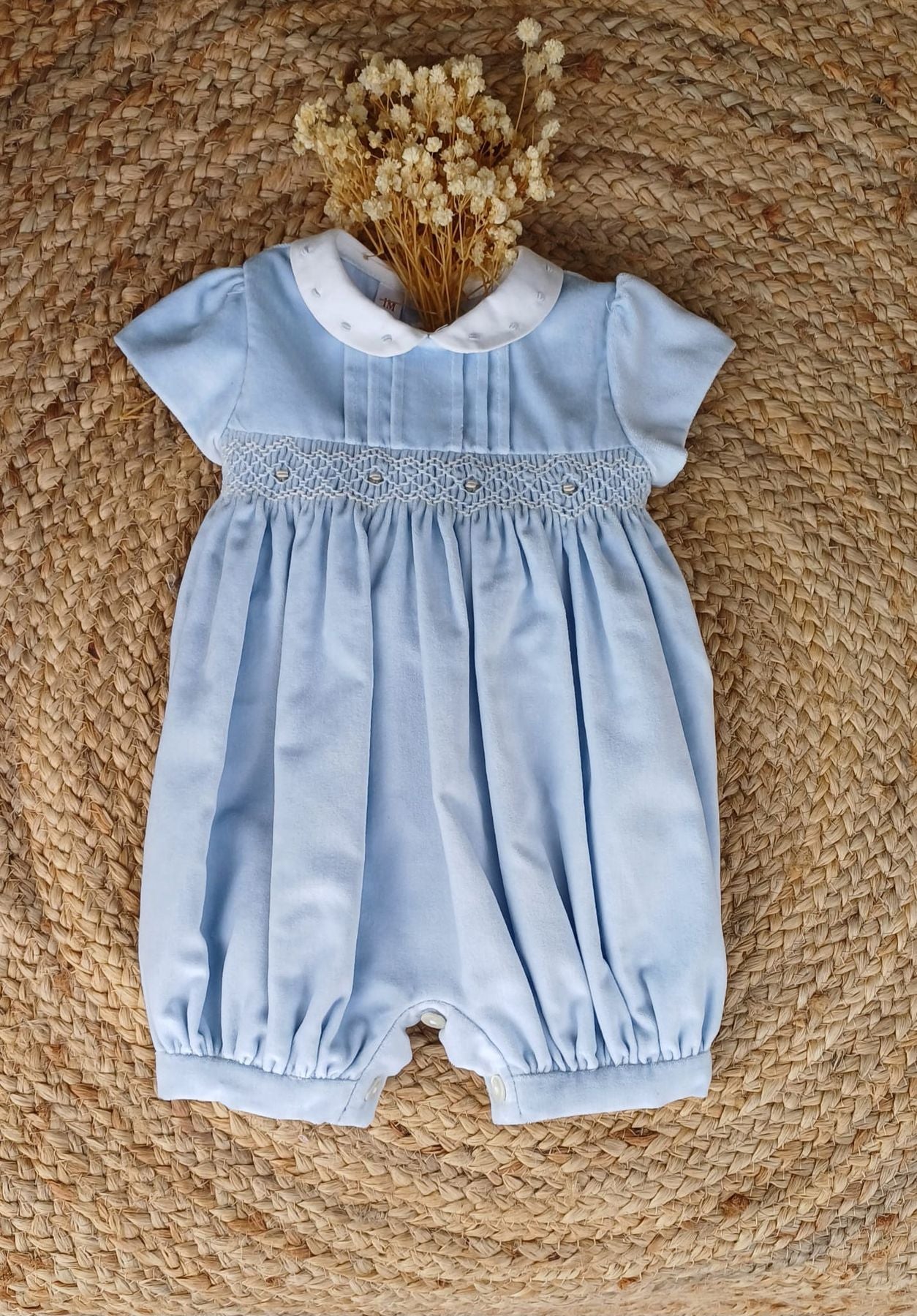 Pagliaccetto in velluto con punto smock e colletto in cotone bianco ricamato