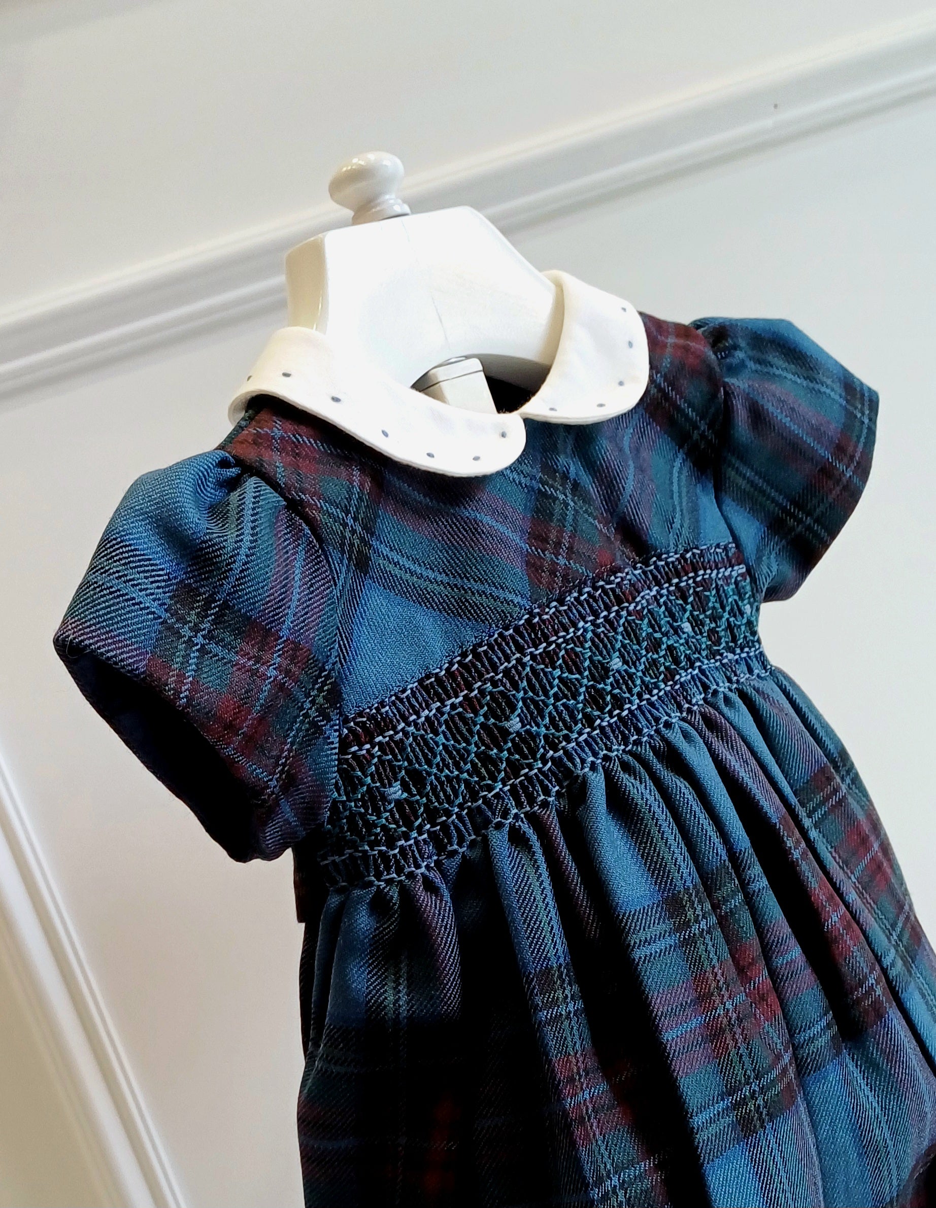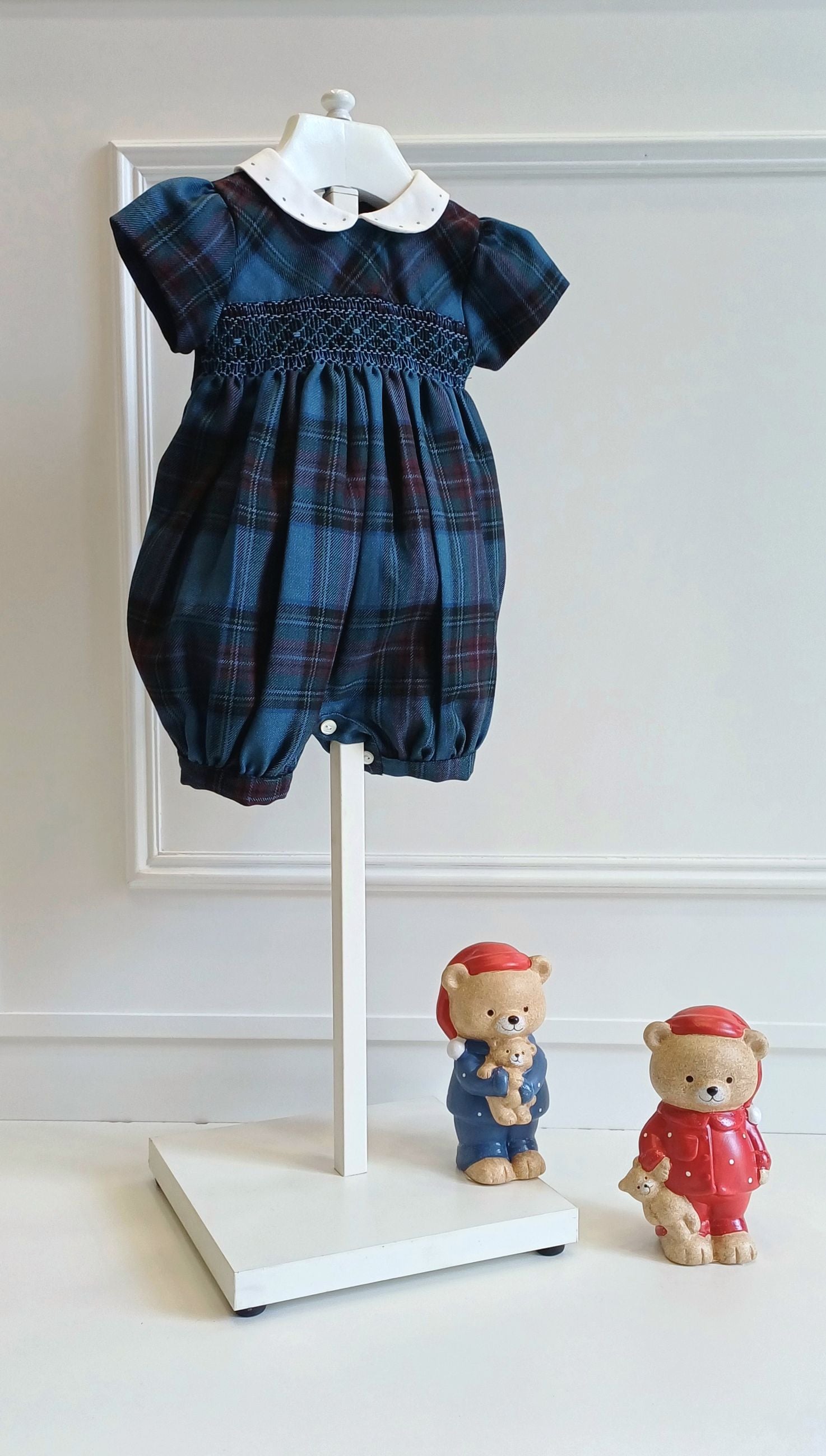 Pagliaccetto in tartan avion con punto smock con ricamo e colletto ricamato in tinta avion