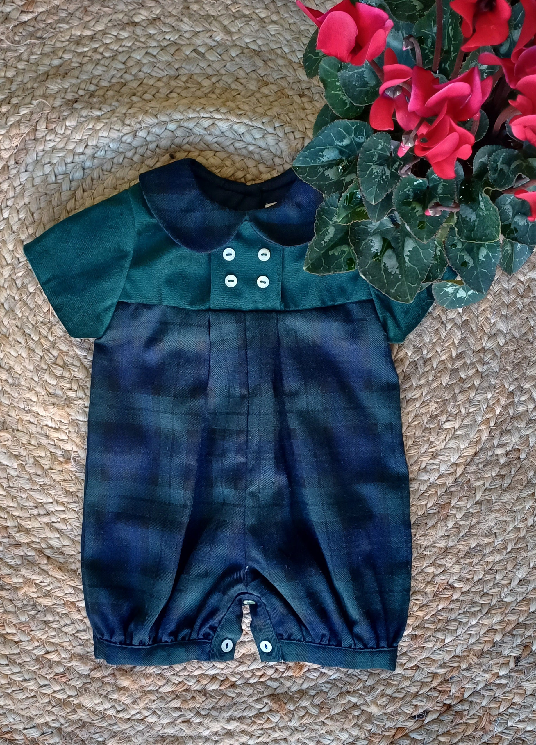 Pagliaccetto doppio petto con top in velluto liscio verde e colletto tondo in tartan verde e blu come il resto del pagliaccetto. Apertura sul retro e tra le gambe