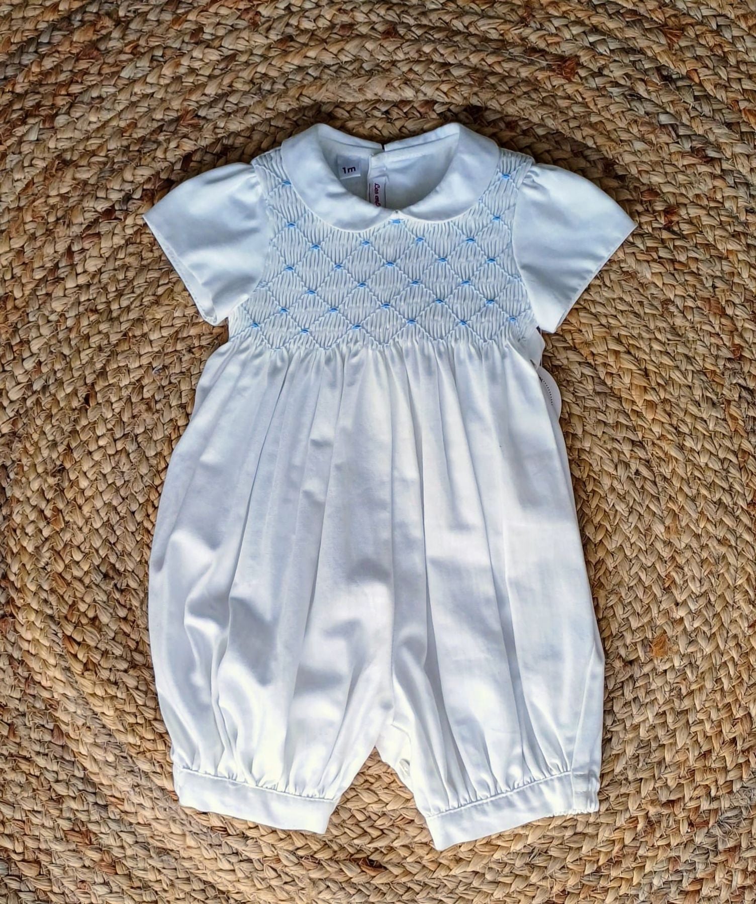 Pagliaccetto bianco latte in caldo cotone con ampio punto smock color azzurro. Apertura con bottoni in madreperla sul retro e tra le gambe