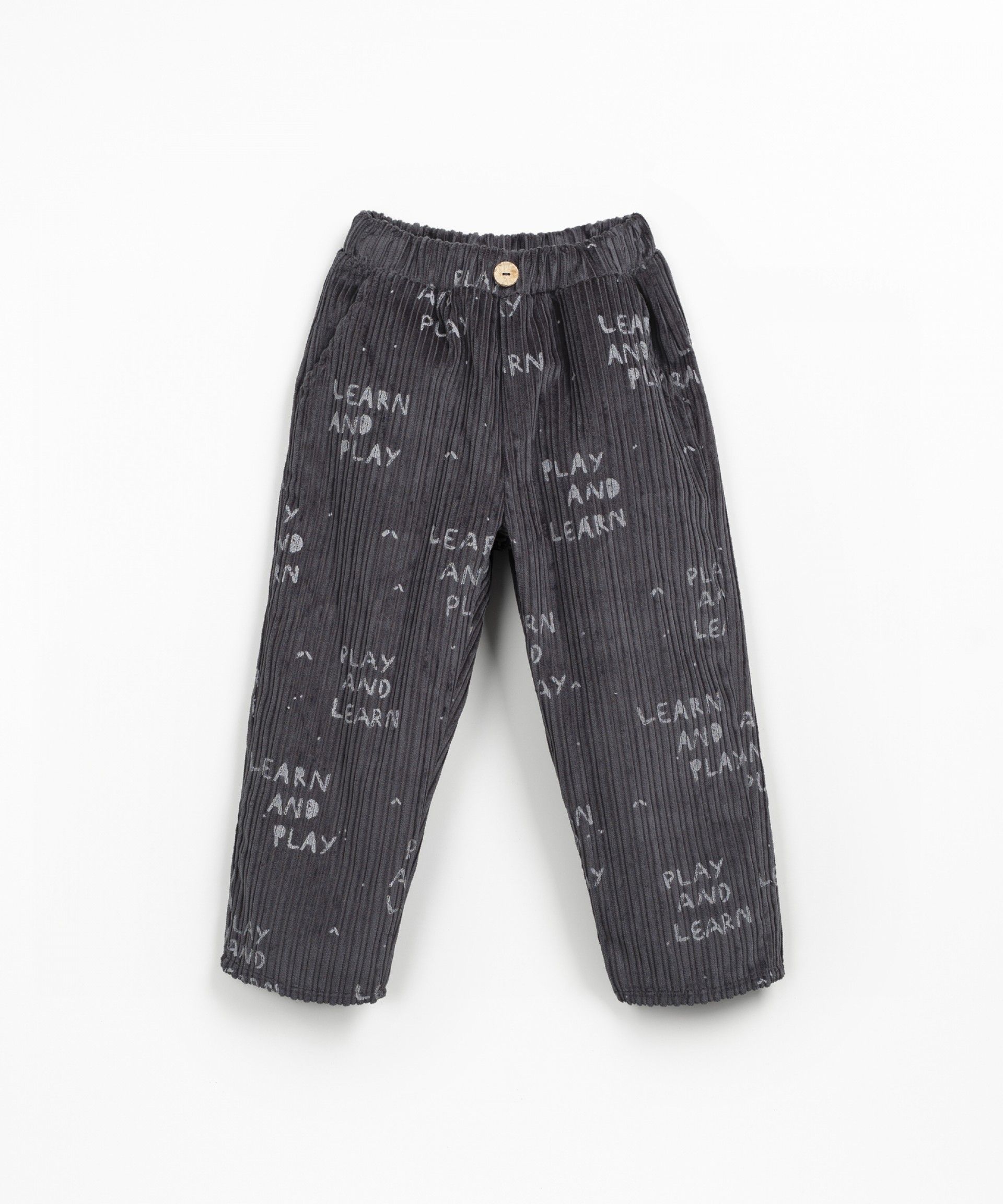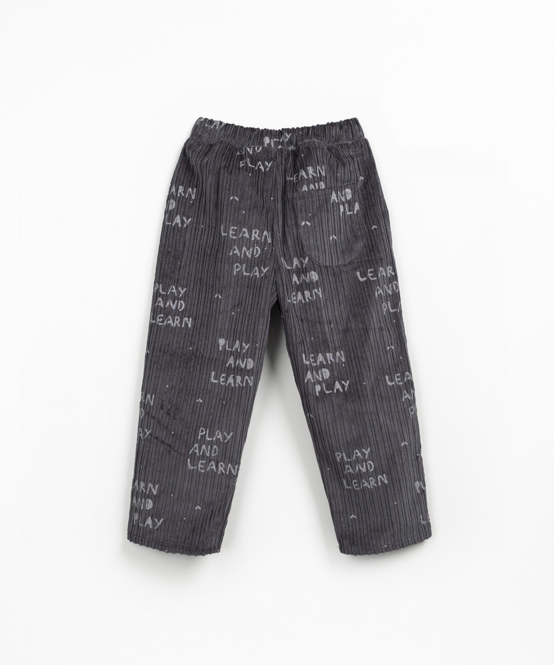 Questi pantaloni in velluto a costa larga sono realizzati in tessuto di cotone color nero con stampa scritte. Presentano un elastico in vita con bottone decorativo e due tasche anteriori.