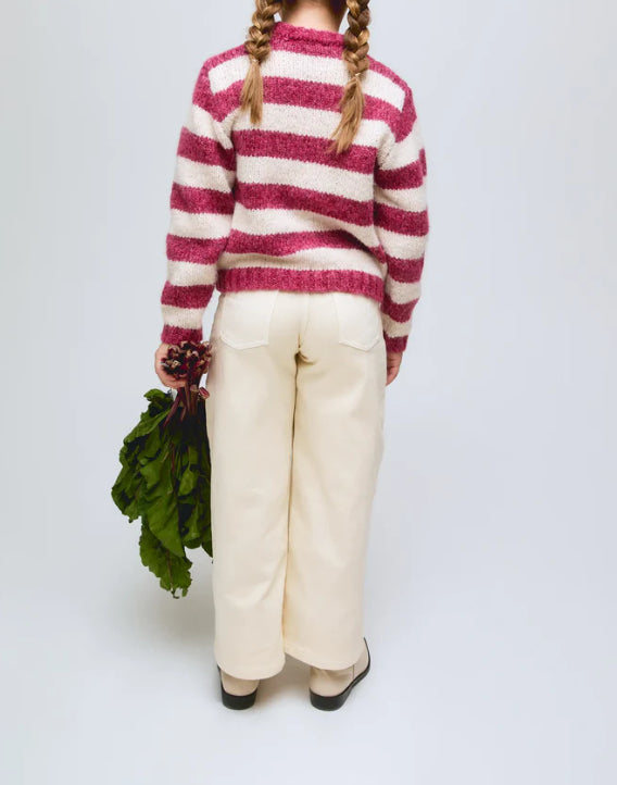 Pantaloni beige da bambina a gamba larga con tasche e vita aderente. Presentano passante per cintura e chiusura con bottone.