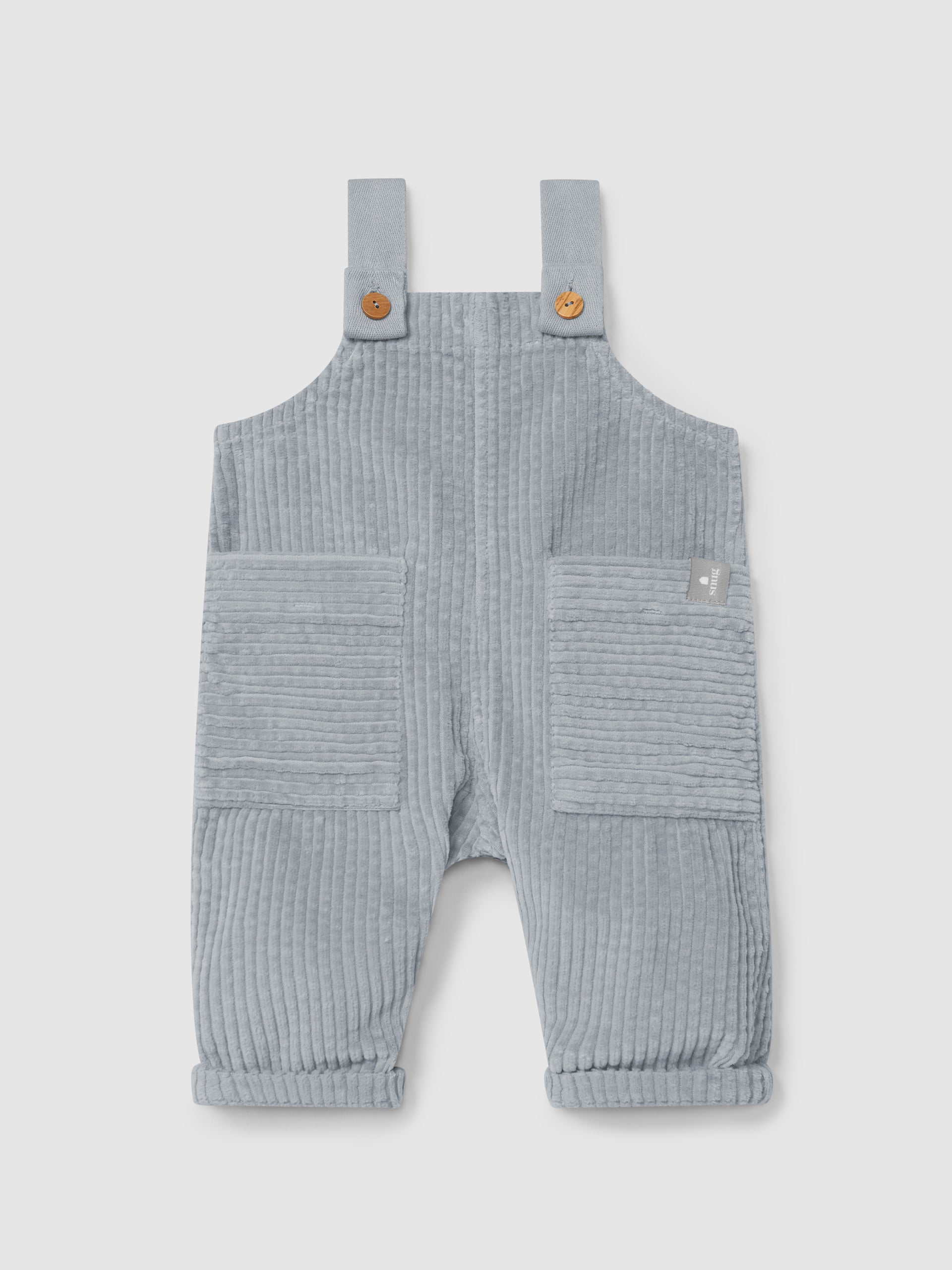 Salopette in velluto a coste 100% cotone biologico con pratiche tasche anteriori. Il risvolto può essere arrotolato o abbassato per una maggiore durata. Chiusura con bottoni in legno a due posizioni e bottoni a pressione tra le gambe fino a 12 mesi.