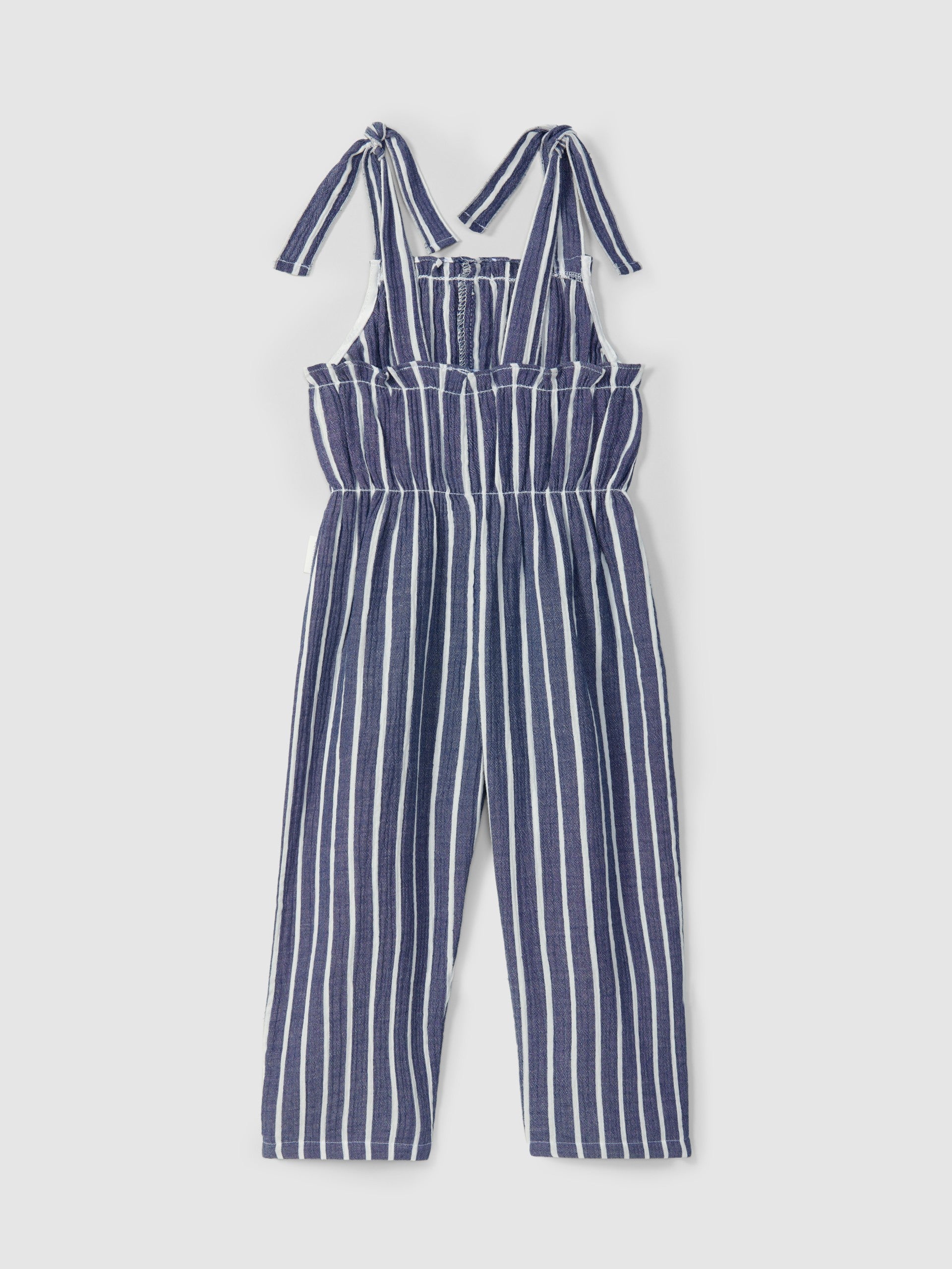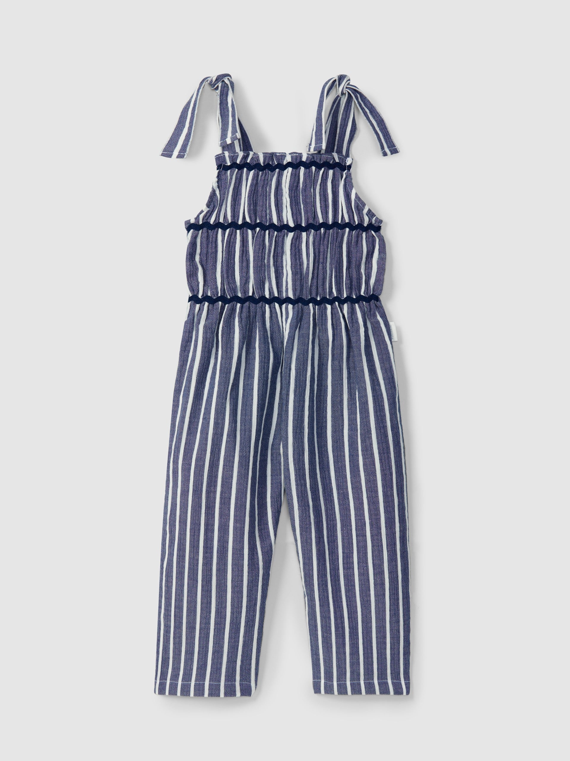 Salopette in garza di cotone 100% con stampa a righe. Dettaglio di risvolto in contrasto colore sul petto ed elastico sul retro per facilitare la vestizione.