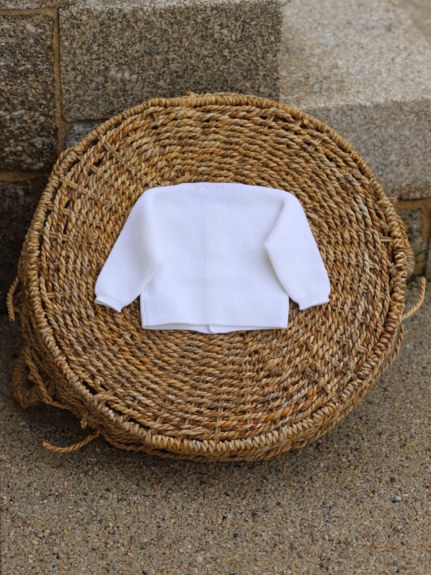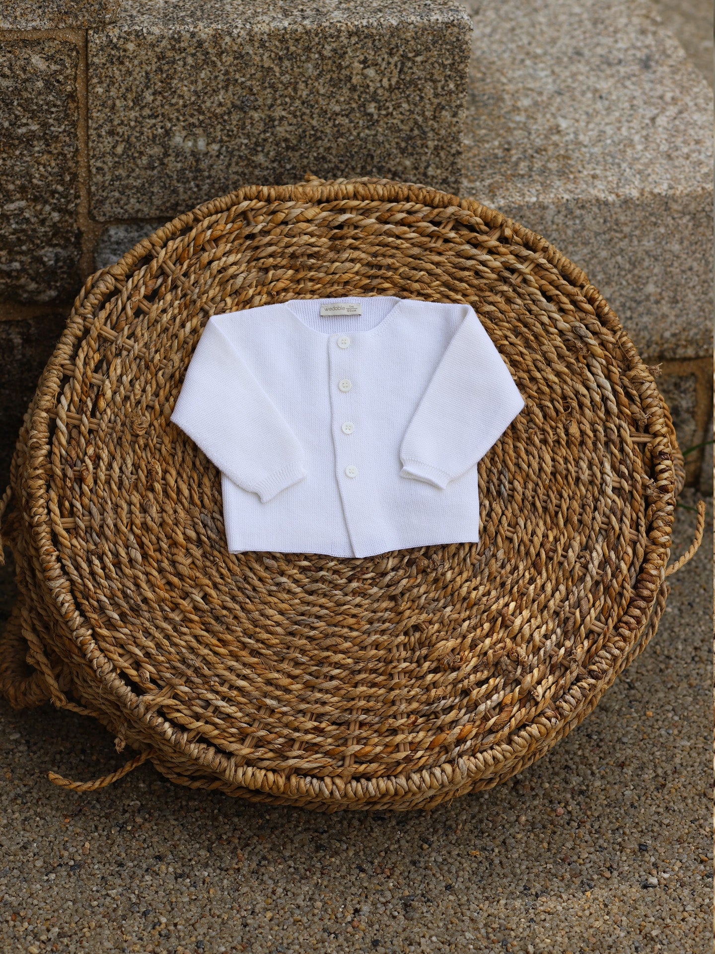 Cardigan corto a maniche lunghe lavorato a maglia in morbida lana merino, perfetto per neonati e bambini. Si chiude sul davanti con bottoni in madreperla.
