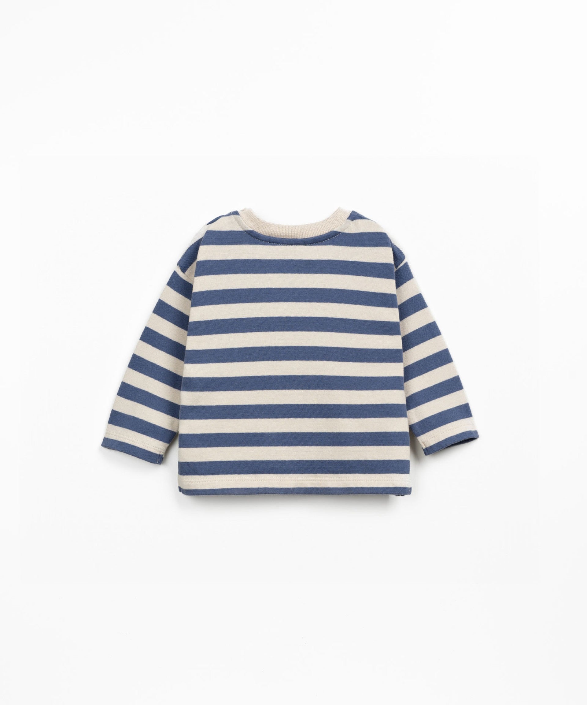 Questa t-shirt è realizzata in maglina con una miscela di cotone biologico e cotone riciclato, nel colore Blu Scuro. È un modello a manica lunga, con scollo rotondo, apertura sulla spalla con bottoni in cocco e con il nostro motivo a righe.