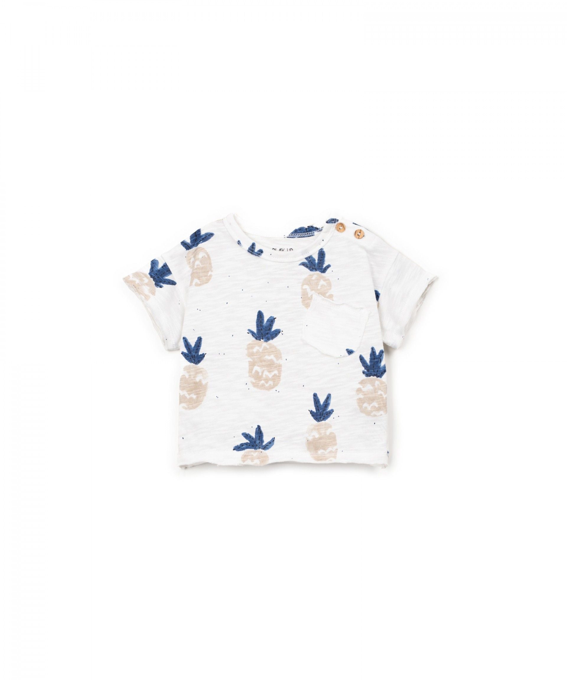 Questa t-shirt è realizzata in jersey di cotone biologico, colore Bianco. È un modello a maniche corte, con scollo rotondo, apertura sulla spalla con bottoni in cocco, taschino applicato sul petto e la nostra stampa di ananas.