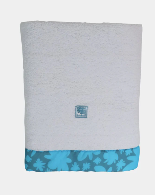 Asciugamano in spugna di cotone 100% con stampa Hibiscus. Il ricamo è realizzato a mano con lo stesso tessuto del resto dell'asciugamano, garantendo anche questa parte molto morbida e una perfetta asciugatura. Dimensioni: 130 x 75 cm.