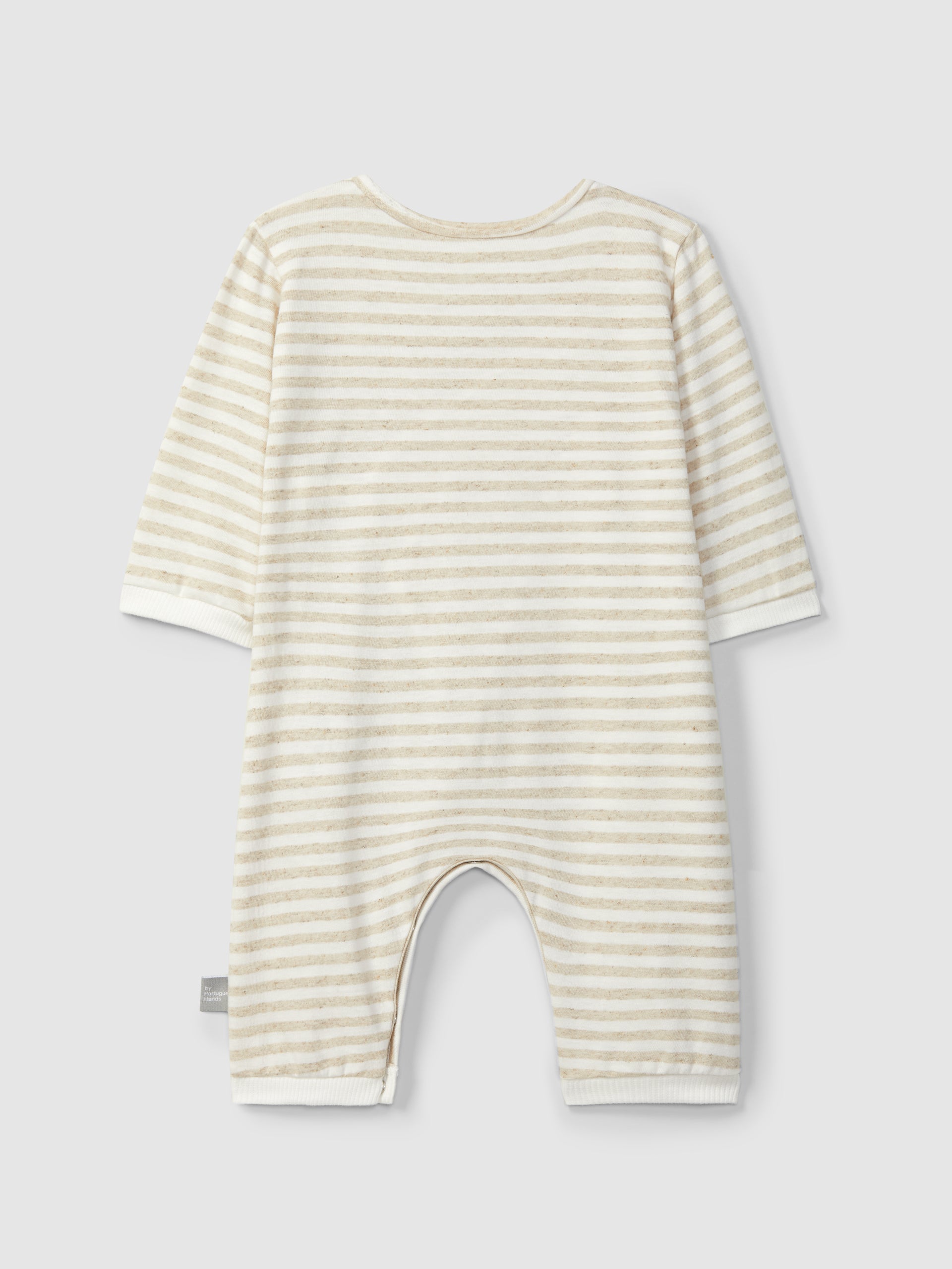 Tutina in jersey di cotone con lino a righe. Incrocio con nastri all'esterno, bottoni automatici all'interno e tra le gambe. Dettaglio di finitura in jersey a costine sui polsini per un maggiore comfort.