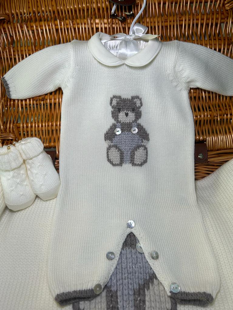 Tutina in 100% lana merinos lavorato a mano con ricamo orsetto, apertura sul retro e tra le gambe con bottoni in madreperla. Colletto bianco in piquet