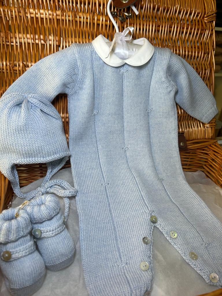 Tutina in 100% lana merinos lavorato a mano con colletto bianco in piquet