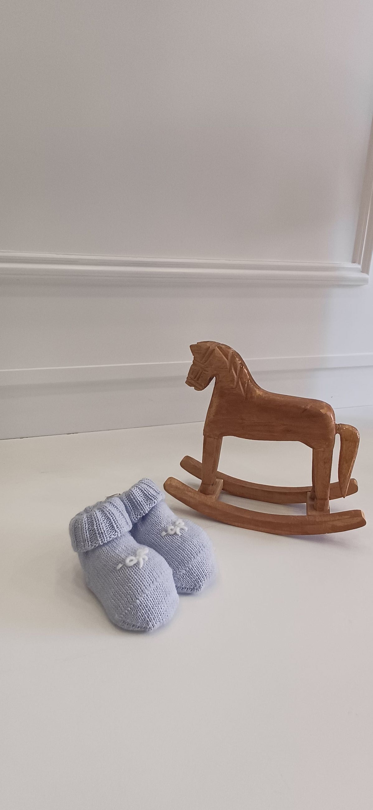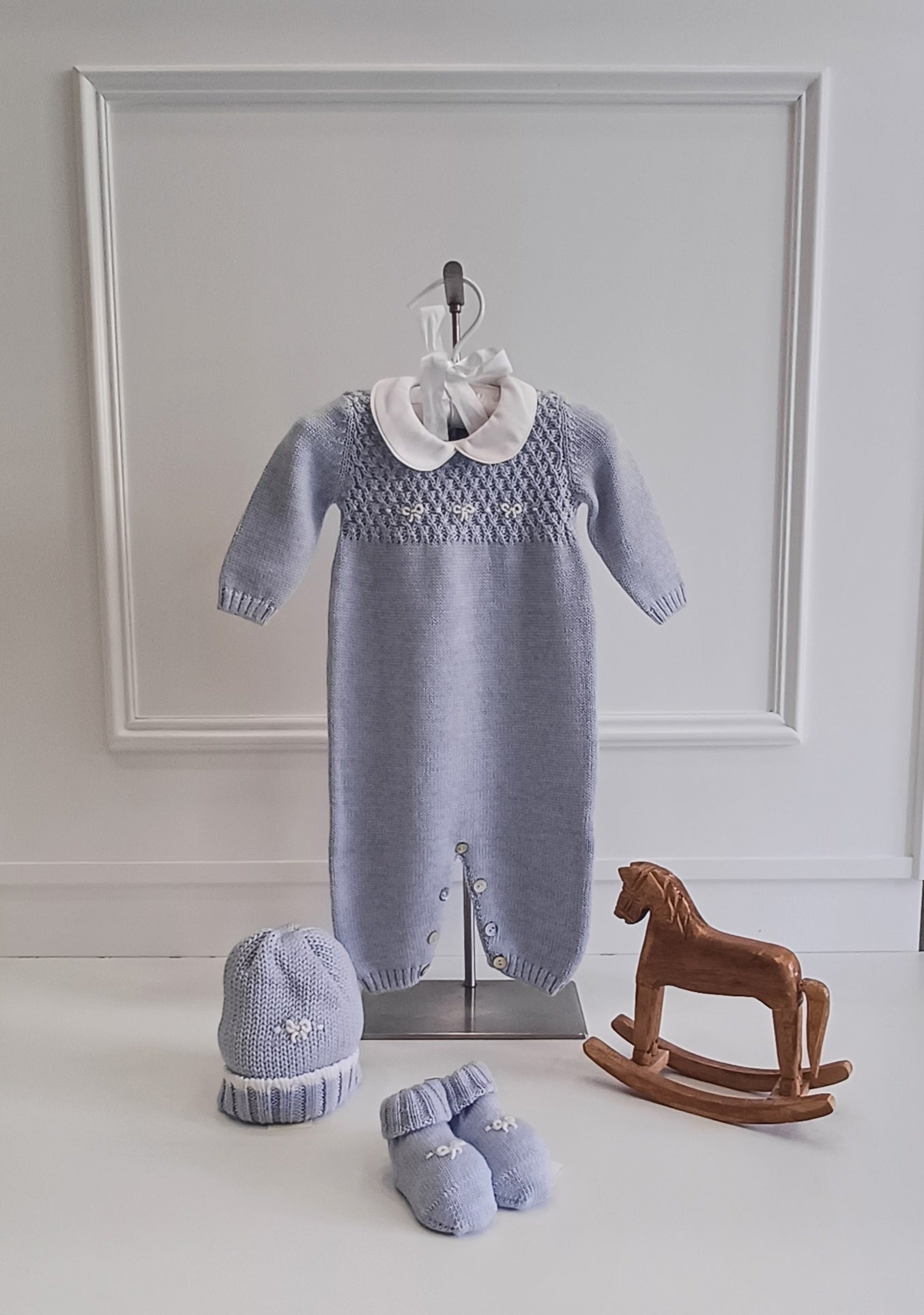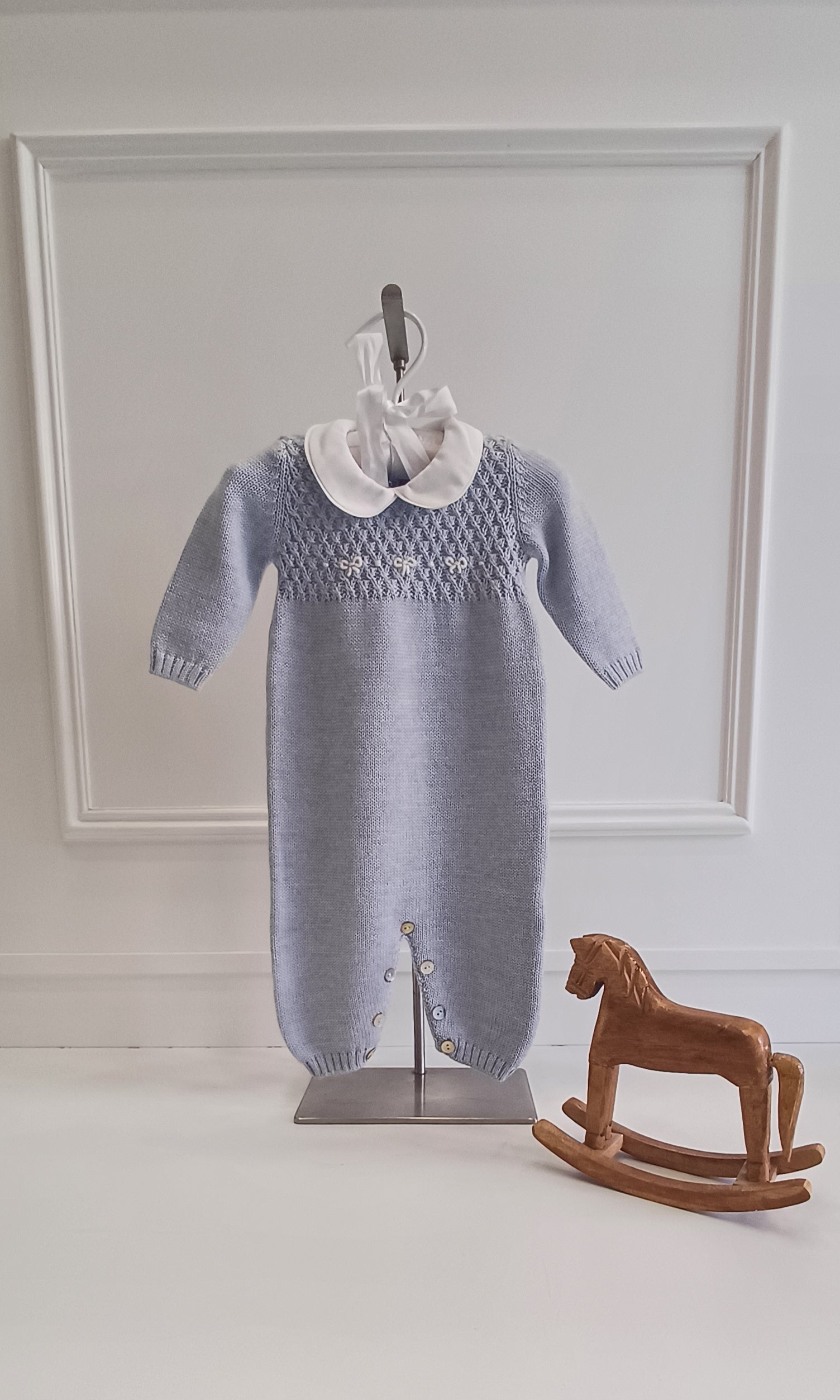 Tutina in lana con collo in cotone piquè. Apertura sul retro e tra le gambe con bottoni in madreperla. Ricami di fiocchetti realizzati a mano
