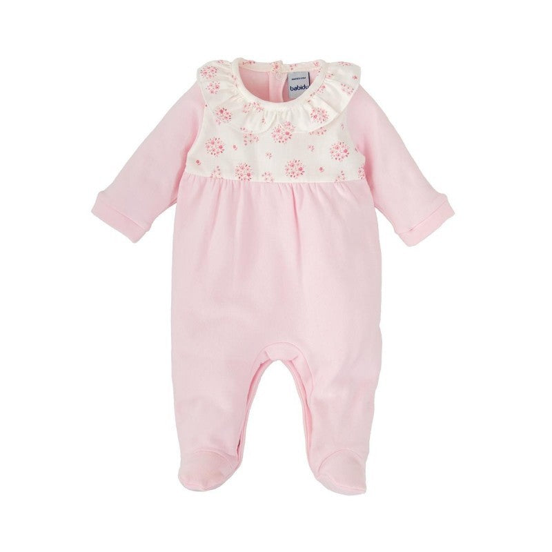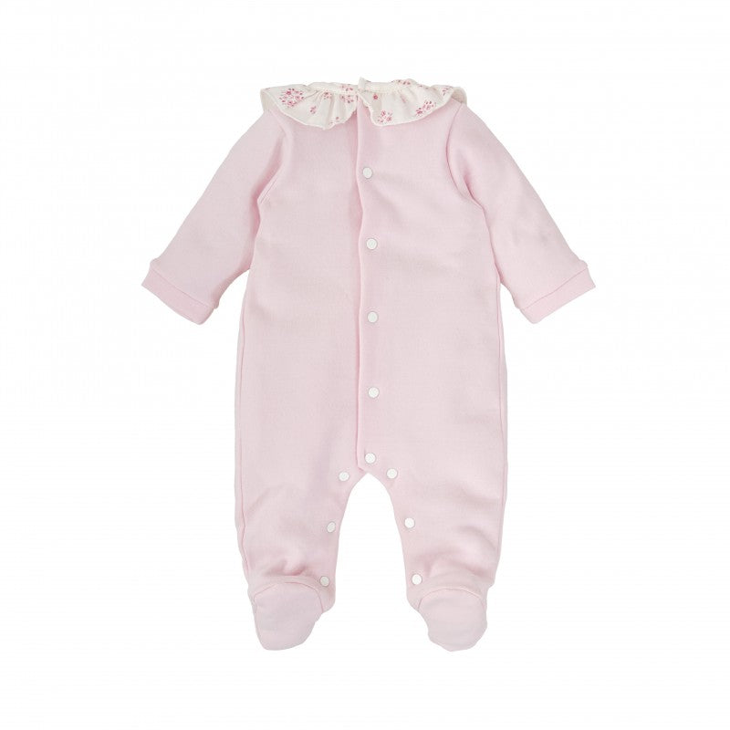Tutina in caldo cotone rosa con colletto tondo e fantasia fiorellini, aperura tra le gambe e sul retro con bottoni automatici.