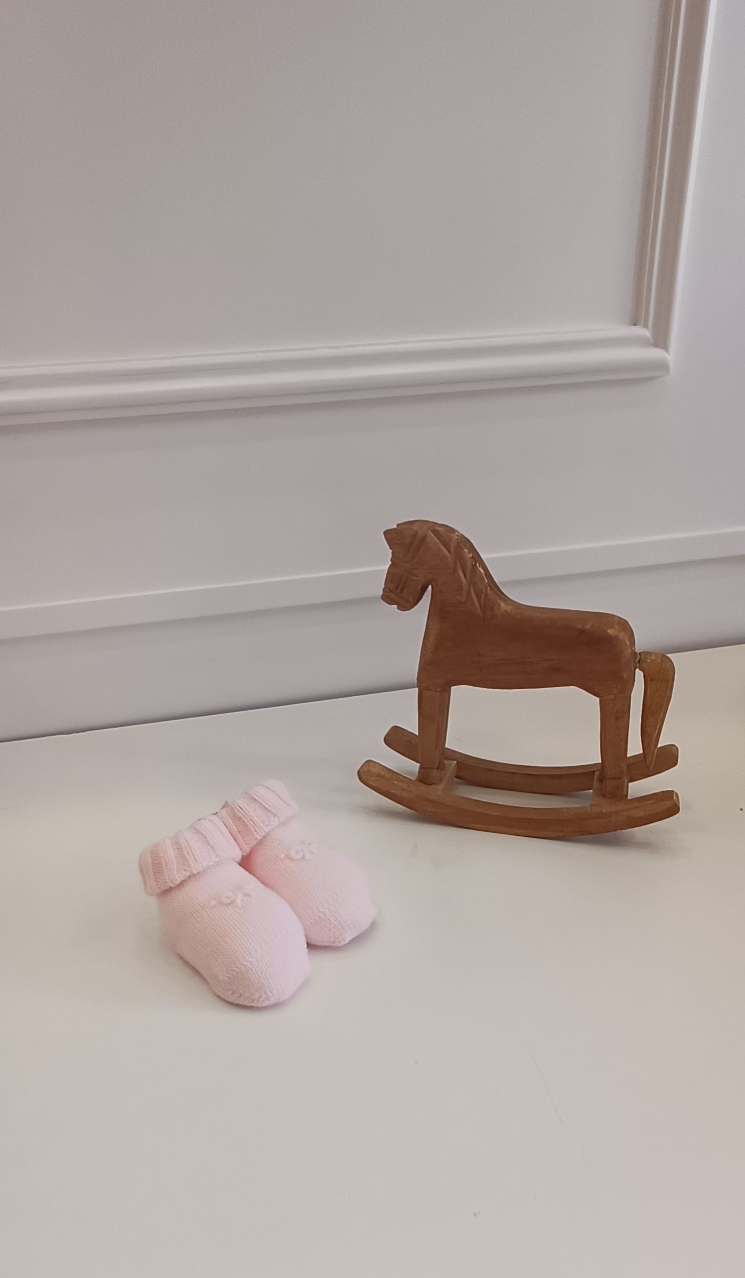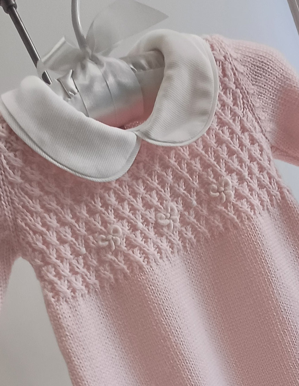 Tutina in lana con collo in cotone piquè. Apertura sul retro e tra le gambe con bottoni in madreperla. Ricami di fiocchetti realizzati a mano