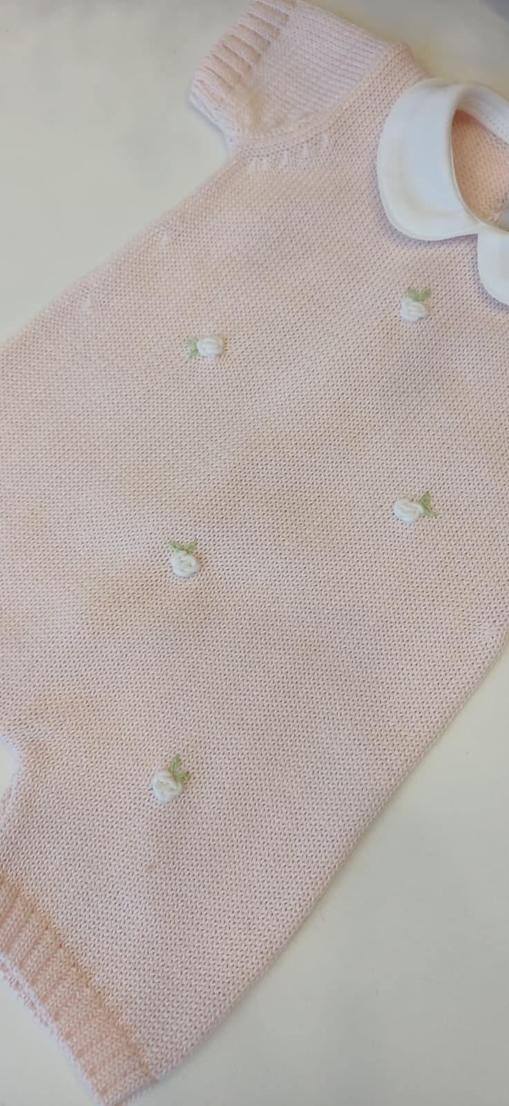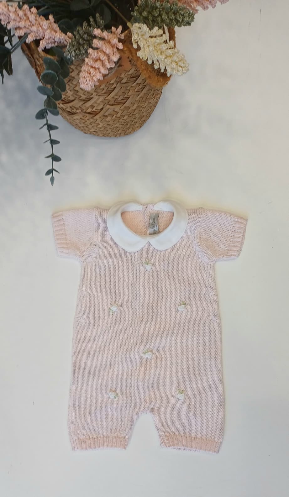Tutina manica corta e gamba corta in filo rosa con roselline bianche ricamate e colletto in piquet bianco. Apertura sul retro e tra le gambe con bottoni in madreperla.